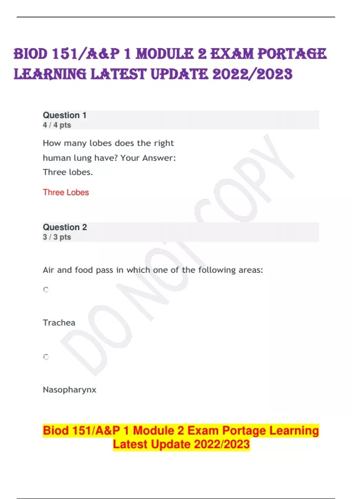 Biod 151/a&p 1 MODULE 2 Exam Portage Learning Latest Update 2022/2023 How many lobes does the right human lung have? Your Answer: Three lobes. Three Lobes Air and food pass in which one of the following areas: Trachea Nasopharynx Biod 151/A&P 1 Module 2 Exam Portage Learning Latest Update 2022/2023 Biod 151/A&P 1 Module 2 Exam Portage Learning Latest Update 2022/2023 Oropharynx Alveoli Biod 151/A&P 1 Module 2 Exam Portage Learning Latest Update 2022/2023 Question 3 3 / 3 pts Biod 151/A&P 1 Module 2 Exam Portage Learning Latest Update 2022/2023 Rings of cartilage line much of the respiratory tract. In which of Biod 151/A&P 1 Module 2 Exam Portage Learning Latest Update 2022/2023 Biod 151/A&P 1 Module 2 Exam Portage Learning Latest Update 2022/2023 one the following would cartilage NOT be found? Trachea Biod
