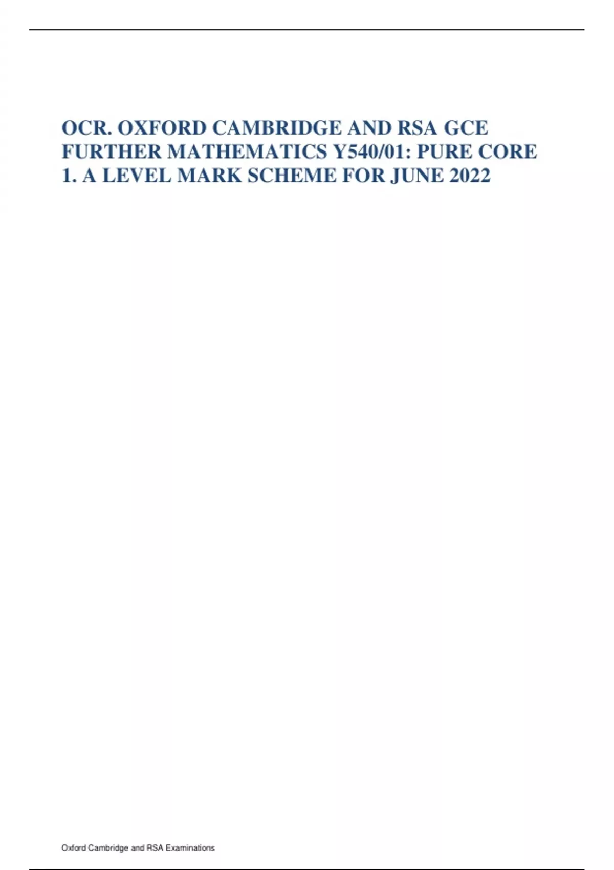 OCR. OXFORD CAMBRIDGE AND RSA GCE FURTHER MATHEMATICS Y540/01: PURE CORE 1. A LEVEL MARK SCHEME FOR JUNE 2022