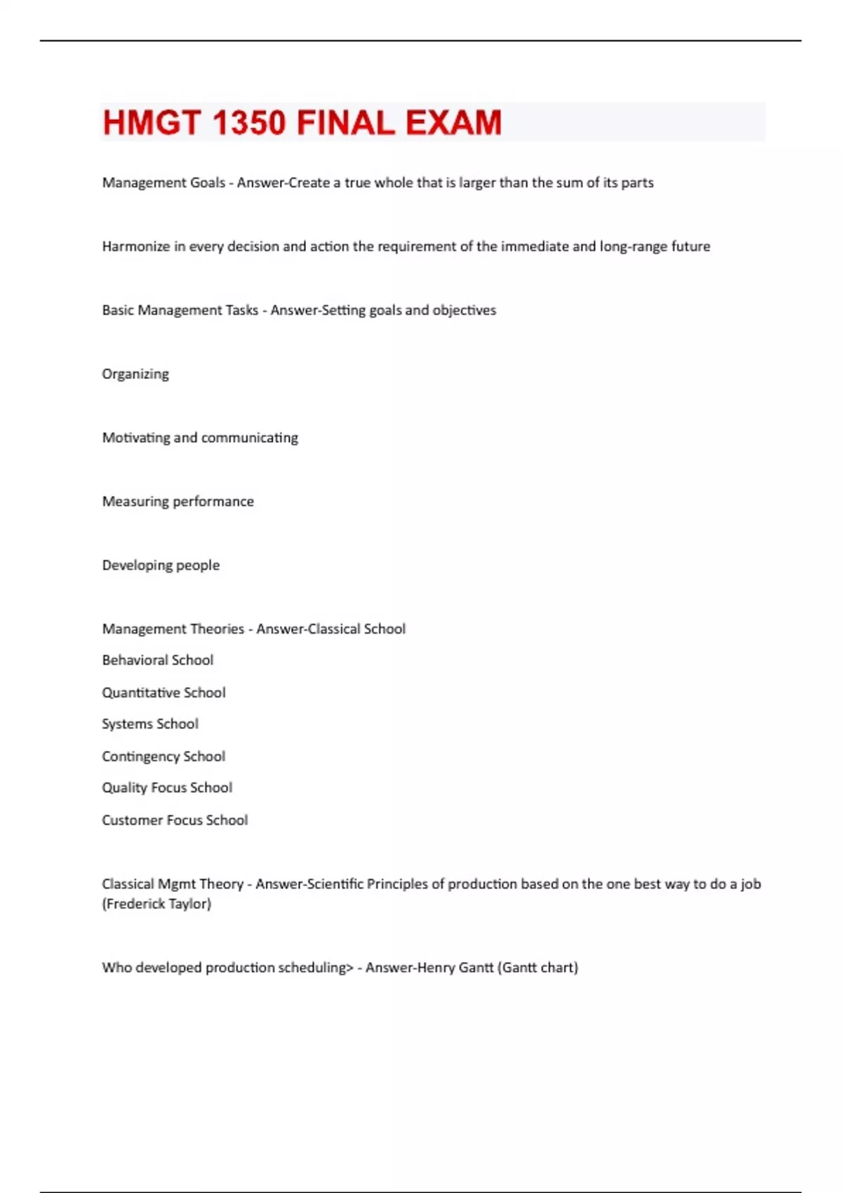 Management Goals - Answer-Create a true whole that is larger than the sum of its parts Harmonize in every decision and action the requirement of the immediate and long-range future Basic Management Tasks - Answer-Setting goals and objectives Organizing Motivating and communicating Measuring performance Developing people Management Theories - Answer-Classical School Behavioral School Quantitative School Systems School Contingency School Quality Focus School Customer Focus School Classical Mgmt Theory - Answer-Scientific Principles of production based on the one best way to do a job (Frederick Taylor) Who developed production scheduling> - Answer-Henry Gantt (Gantt chart)Who believed the manager's role is to be a regulator and integrator? - Answer-Henri Fayol Fay's 14 principles - Answer-Division of Work Authority and responsibility Discipline Unity of command Unity of direction Subordination of individual interest to general interest Payment of personnel Centralization Scalar chain Order Equity Stability of Tenure of Personnel Initiative Espirit de corps Behavioral School - Answer-How the worker is motivated besides rules and wages Who believed mesh employees goals with organizational goals? - Answer-Barnard Who believed it's the link between supervision, morale and productivity - Answer-Mayo and Hawthorne Maslow's Hierarchy of Needs (Pyramid top to bottom) - Answer-Self actualization Esteem Social or Belonging Safety PhysiologicalMcGregor's Theory X and Y - Answer-*X:* People dislike work, must be coerced to work *Y:* Work is as natural as playing and resting so we must enjoy it naturally Quantitative School - Answer-Math approach to mgmt problems All about short term goals and ignored morale and customer satisfaction Systems School - Answer-Viewed as internal and external systems