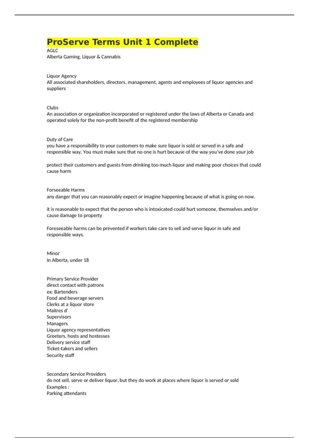 ProServe Terms Unit 1 Complete AGLC Alberta Gaming, Liquor & Cannabis Liquor Agency All associated shareholders, directors, management, agents and employees of liquor agencies and suppliers Clubs An association or organization incorporated or registered under the laws of Alberta or Canada and operated solely for the non-profit benefit of the registered membership Duty of Care you have a responsibility to your customers to make sure liquor is sold or served in a safe and responsible way. You must make sure that no one is hurt because of the way you've done your job protect their customers and guests from drinking too much liquor and making poor choices that could cause harm Forseeable Harms any danger that you can reasonably expect or imagine happening because of what is going on now. it is reasonable to expect that the person who is intoxicated could hurt someone, themselves and/or cause damage to property Foreseeable harms can be prevented if workers take care to sell and serve liquor in safe and responsible ways. Minor In Alberta, under 18 Primary Service Provider direct contact with patrons ex: Bartenders Food and beverage servers Clerks at a liquor store Maitres d' Supervisors Managers Liquor agency representatives Greeters, hosts and hostesses Delivery service staff Ticket-takers and sellers Security staff Secondary Service Providers do not sell, serve or deliver liquor, but they do work at places where liquor is served or sold Examples : Parking attendants