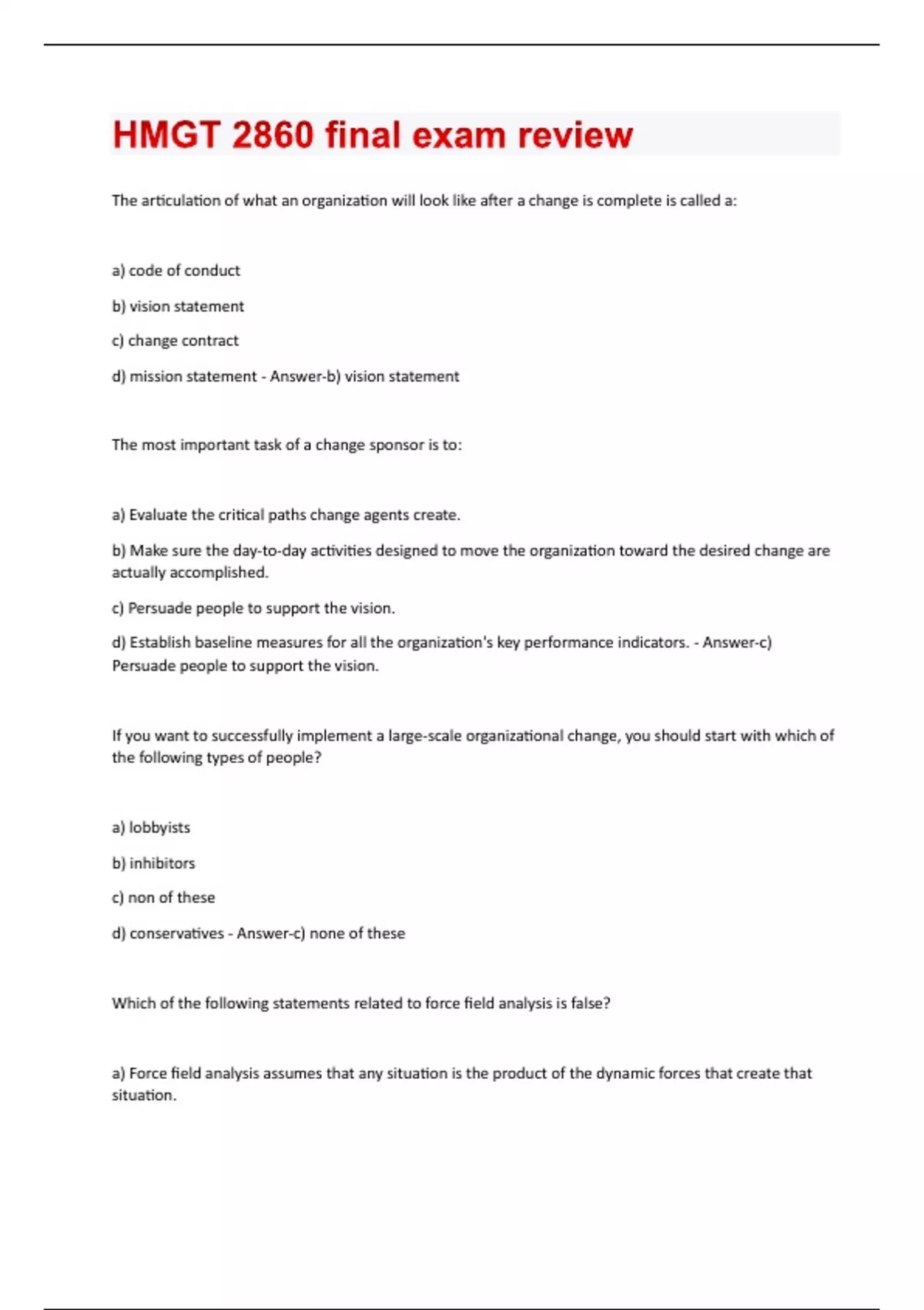 The articulation of what an organization will look like after a change is complete is called a: a) code of conduct b) vision statement c) change contract d) mission statement - Answer-b) vision statement The most important task of a change sponsor is to: a) Evaluate the critical paths change agents create. b) Make sure the day-to-day activities designed to move the organization toward the desired change are actually accomplished. c) Persuade people to support the vision. d) Establish baseline measures for all the organization's key performance indicators. - Answer-c) Persuade people to support the vision. If you want to successfully implement a large-scale organizational change, you should start with which of the following types of people? a) lobbyists b) inhibitors c) non of these d) conservatives - Answer-c) none of these Which of the following statements related to force field analysis is false? a) Force field analysis assumes that any situation is the product of the dynamic forces that create that situation.b) Force field analysis was developed in the late 1940s. c) none of these d) There are four types of forces acting upon any situation. - Answer-d) There are four types of forces acting upon any situation. Which of the following statements about change is false? a) Effective change is time-consuming. b) It is difficult to change. c) In the early part of a change process, style is just as important as substance. d) none of these - Answer-d) none of these The complete redesign of an organizational process is called: a) reconfiguration b) re-engineering c) re-authentication d) reivention - Answer-b) re-engineering Which one of the following is not one of Deming's 14 points of management? a) Institute leadership b) Remove barriers that rob employees of pride of workmanship c) Cease dependence on inspection to achieve quality d) Select vendors that offer products at minimal costs - Answer-d) select vendors that offer products at minimal costs T or F: Companies need to cut costs and select vendors with the lowest prices. - Answer-FalseWhat might prevent employees from taking pride in their work? a) Performance appraisals b) all of these c) Poor tools d) Misguided supervisors - Answer-b) all of these