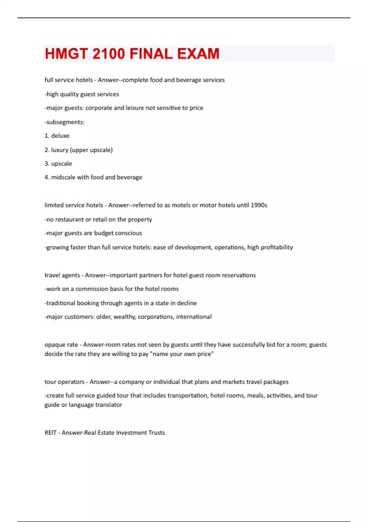 full service hotels - Answer--complete food and beverage services -high quality guest services -major guests: corporate and leisure not sensitive to price -subsegments: 1. deluxe 2. luxury (upper upscale) 3. upscale 4. midscale with food and beverage limited service hotels - Answer--referred to as motels or motor hotels until 1990s -no restaurant or retail on the property -major guests are budget conscious -growing faster than full service hotels: ease of development, operations, high profitability travel agents - Answer--important partners for hotel guest room reservations -work on a commission basis for the hotel rooms -traditional booking through agents in a state in decline -major customers: older, wealthy, corporations, international opaque rate - Answer-room rates not seen by guests until they have successfully bid for a room; guests decide the rate they are willing to pay "name your own price" tour operators - Answer--a company or individual that plans and markets travel packages -create full service guided tour that includes transportation, hotel rooms, meals, activities, and tour guide or language translator REIT - Answer-Real Estate Investment Trusts-public stock issuing investment companies -designed to facilitate investment in real estate -enable small investors to combine their funds -pays little or no corporate income tax 1st tier management companies - Answer--AKA brand operators -operate hotels for owners using the management companies trade name as the hotel brand -common among larger full service hotels 2nd tier management companies - Answer--AKA independent operator -operate hotels for owners and do not use the management companies name as part of the hotel name -own properties via franchise -eg. interstate hotels and resorts advantages of hotel mgmt companies - Answer--operational expertise can be obtained -mgmt quality can be improved -payment for services can be tied to performance -future partnership opportunities can be enhanced