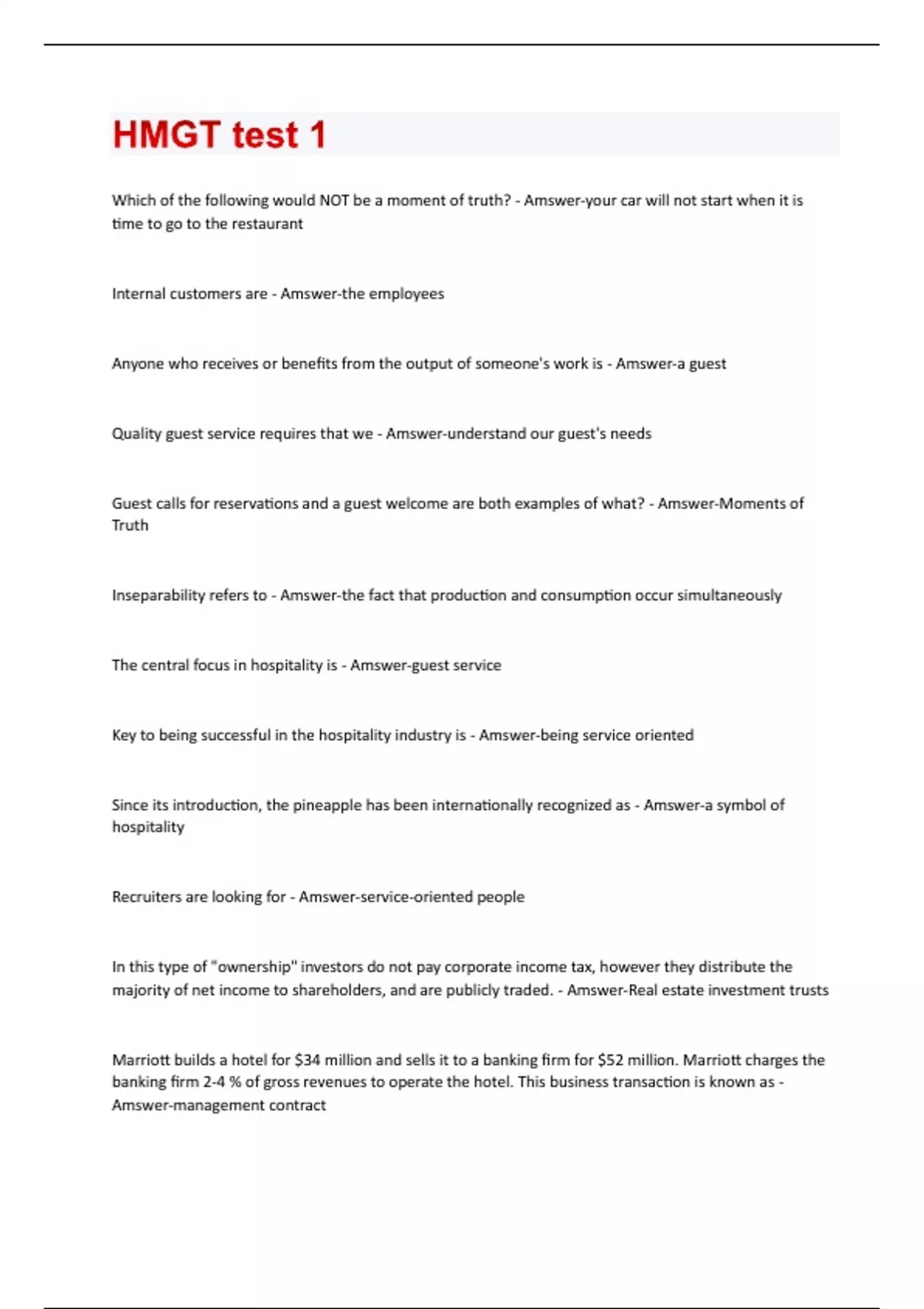 Which of the following would NOT be a moment of truth? - Amswer-your car will not start when it is time to go to the restaurant Internal customers are - Amswer-the employees Anyone who receives or benefits from the output of someone's work is - Amswer-a guest Quality guest service requires that we - Amswer-understand our guest's needs Guest calls for reservations and a guest welcome are both examples of what? - Amswer-Moments of Truth Inseparability refers to - Amswer-the fact that production and consumption occur simultaneously The central focus in hospitality is - Amswer-guest service Key to being successful in the hospitality industry is - Amswer-being service oriented Since its introduction, the pineapple has been internationally recognized as - Amswer-a symbol of hospitality Recruiters are looking for - Amswer-service-oriented people In this type of "ownership" investors do not pay corporate income tax, however they distribute the majority of net income to shareholders, and are publicly traded. - Amswer-Real estate investment trusts Marriott builds a hotel for $34 million and sells it to a banking firm for $52 million. Marriott charges the banking firm 2-4 % of gross revenues to operate the hotel. This business transaction is known as - Amswer-management contractCasino hotels - Amswer-are marketing themselves as business hotels In order to determine if a hotel development project would likely succeed, we would perform a - Amswer-feasibility study Examples of hotel price classification include - Amswer-luxury, all suites, economy, budget The fastest growing segment of the travel industry is - Amswer-vacation ownership Airport hotels - Amswer-range from 200-600 rooms with full service Examples of hotel level of service classification include - Amswer-full service, mid-scale, extended stay, limited service Hotels and motels that are part of a ________ share a centralized reservation system and a common image, logo or advertising slogan. - Amswer-referral association Franchising fees vary according to the agreements between franchisee and franchisor but the usual fees are between ________ of room revenue - Amswer-3 and 4% Housekeeping department measures productivity by - Amswer-person hours per room