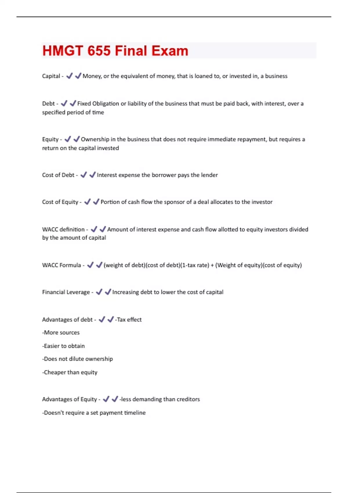 Capital - Money, or the equivalent of money, that is loaned to, or invested in, a business Debt - Fixed Obligation or liability of the business that must be paid back, with interest, over a specified period of time Equity - Ownership in the business that does not require immediate repayment, but requires a return on the capital invested Cost of Debt - Interest expense the borrower pays the lender Cost of Equity - Portion of cash flow the sponsor of a deal allocates to the investor WACC definition - Amount of interest expense and cash flow allotted to equity investors divided by the amount of capital WACC Formula - (weight of debt)(cost of debt)(1-tax rate) + (Weight of equity)(cost of equity) Financial Leverage - Increasing debt to lower the cost of capital Advantages of debt - -Tax effect -More sources -Easier to obtain -Does not dilute ownership -Cheaper than equity Advantages of Equity - -less demanding than creditors -Doesn't require a set payment timeline-Owners cannot close a business -Partners can add experience Principal - amount of money borrowed Term - Number of months or years given to repay the loan Interest - Amount paid to the lender for lending the funds Principal repayment - Portion of debt service that reduces the amount of money owed to the lender Amortization rate - Number of years debt service calculation is based upon Collateral - Asset offered to lender as loan insurance