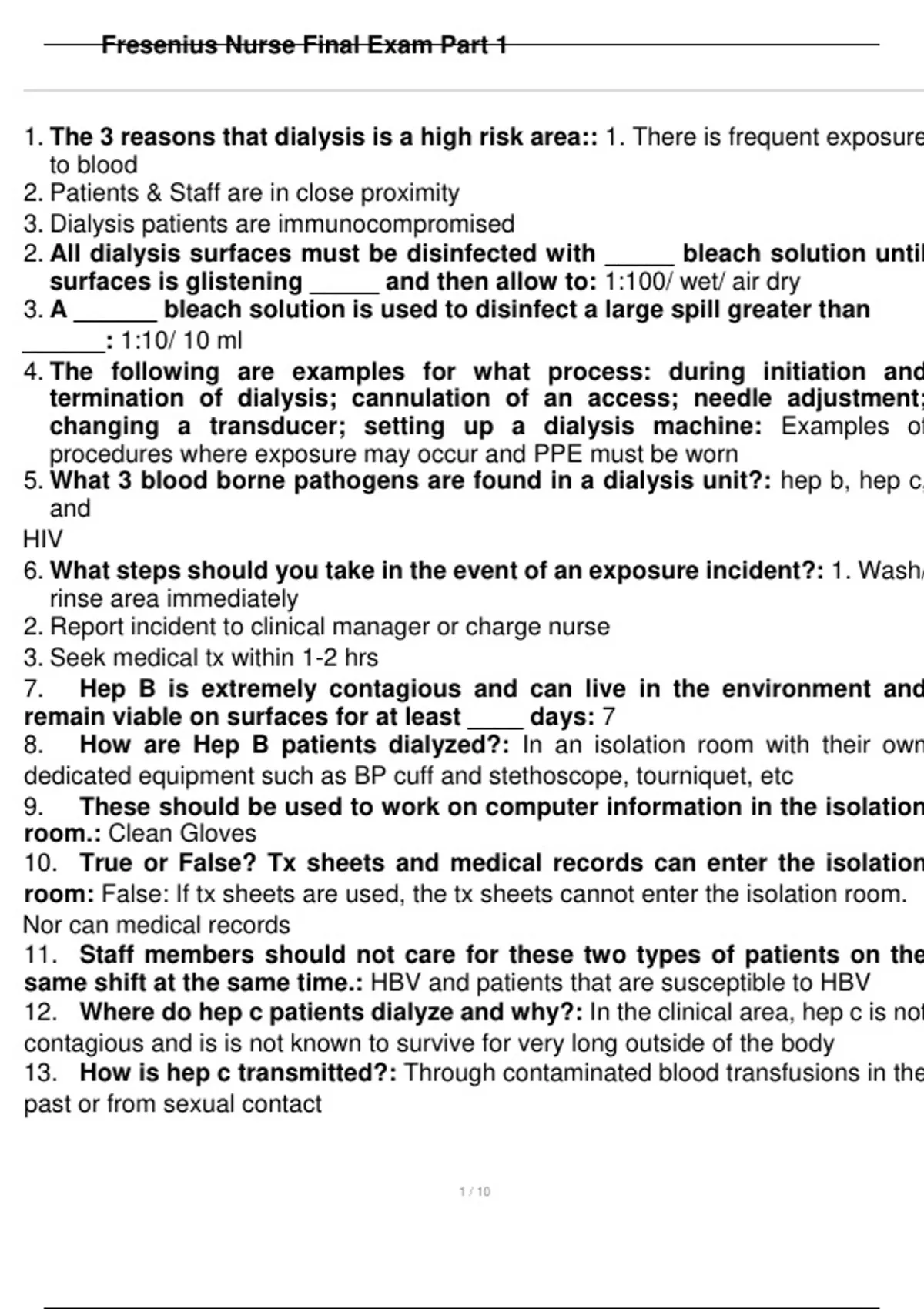 Fresenius Nurse Final Exam Part 1 | 100% Correct Answers | Verified | Latest 2024 Version