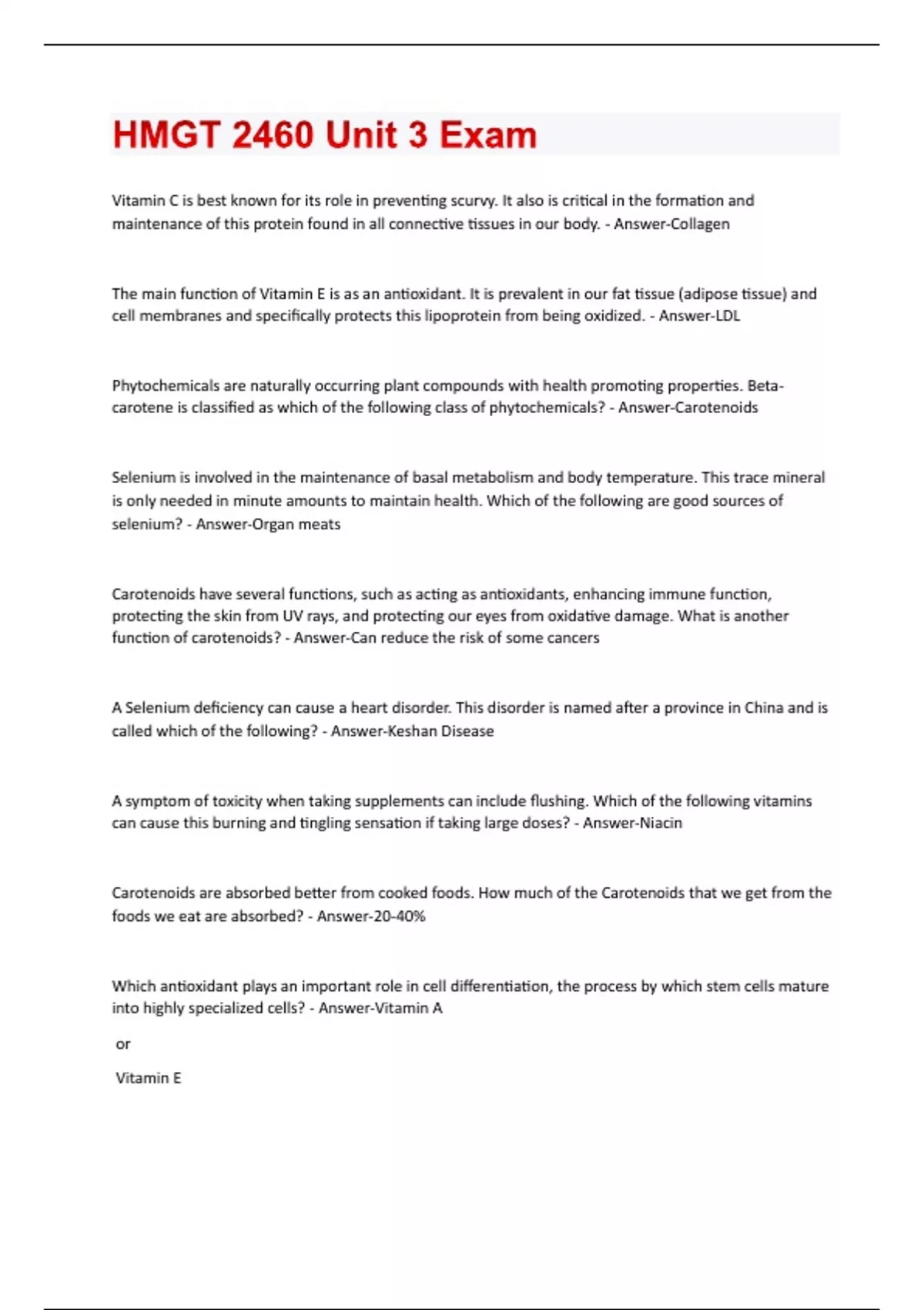 Vitamin C is best known for its role in preventing scurvy. It also is critical in the formation and maintenance of this protein found in all connective tissues in our body. - Answer-Collagen The main function of Vitamin E is as an antioxidant. It is prevalent in our fat tissue (adipose tissue) and cell membranes and specifically protects this lipoprotein from being oxidized. - Answer-LDL Phytochemicals are naturally occurring plant compounds with health promoting properties. Betacarotene is classified as which of the following class of phytochemicals? - Answer-Carotenoids Selenium is involved in the maintenance of basal metabolism and body temperature. This trace mineral is only needed in minute amounts to maintain health. Which of the following are good sources of selenium? - Answer-Organ meats Carotenoids have several functions, such as acting as antioxidants, enhancing immune function, protecting the skin from UV rays, and protecting our eyes from oxidative damage. What is another function of carotenoids? - Answer-Can reduce the risk of some cancers A Selenium deficiency can cause a heart disorder. This disorder is named after a province in China and is called which of the following? - Answer-Keshan Disease A symptom of toxicity when taking supplements can include flushing. Which of the following vitamins can cause this burning and tingling sensation if taking large doses? - Answer-Niacin Carotenoids are absorbed better from cooked foods. How much of the Carotenoids that we get from the foods we eat are absorbed? - Answer-20-40% Which antioxidant plays an important role in cell differentiation, the process by which stem cells mature into highly specialized cells? - Answer-Vitamin A or Vitamin ESince we are unable to form antioxidants, we must consume them in our diet. Which of the following vitamins functions as an antioxidant and is critical to the formation and maintenance of collagen? - Answer-Vitamin C This trace mineral is considered an antioxidant and is part of glutathione peroxidase. It helps spare Vitamin E and prevents oxidative damage to our cell membranes. - Answer-Selenium This antioxidant is also a fat-soluble vitamin and is found in many foods, such as vegetable oils, nuts, and seeds. - Answer-Vitamin E This is a chemical reaction in which molecules of a substance are broken down into their component atoms. During this process, atoms lose electrons. - Answer-Oxidation Retinol, cholecalciferol, tocopherol, and phylloquinone are all names of what? - Answer-Fat-soluble vitamins Oxidation occurs during metabolism and can result in the formation of which of the following? - AnswerFree radicals or Provitamin Antioxidants work by stabilizing free radicals or opposing oxidation, therefore protecting our cells from damage. There are certain minerals that function within complex antioxidant enzyme systems and are called what? - Answer-Prooxidant or Cofactor This vitamin enables our eyes to react to changes in light and to see colors. A deficiency can result in night blindness. - Answer-Vitamin A Folate is required for DNA synthesis and cell division, metabolism of amino acids and for synthesis of normal red blood cells. What is the best source of folate in the diet? - Answer-Cooked potatoes
