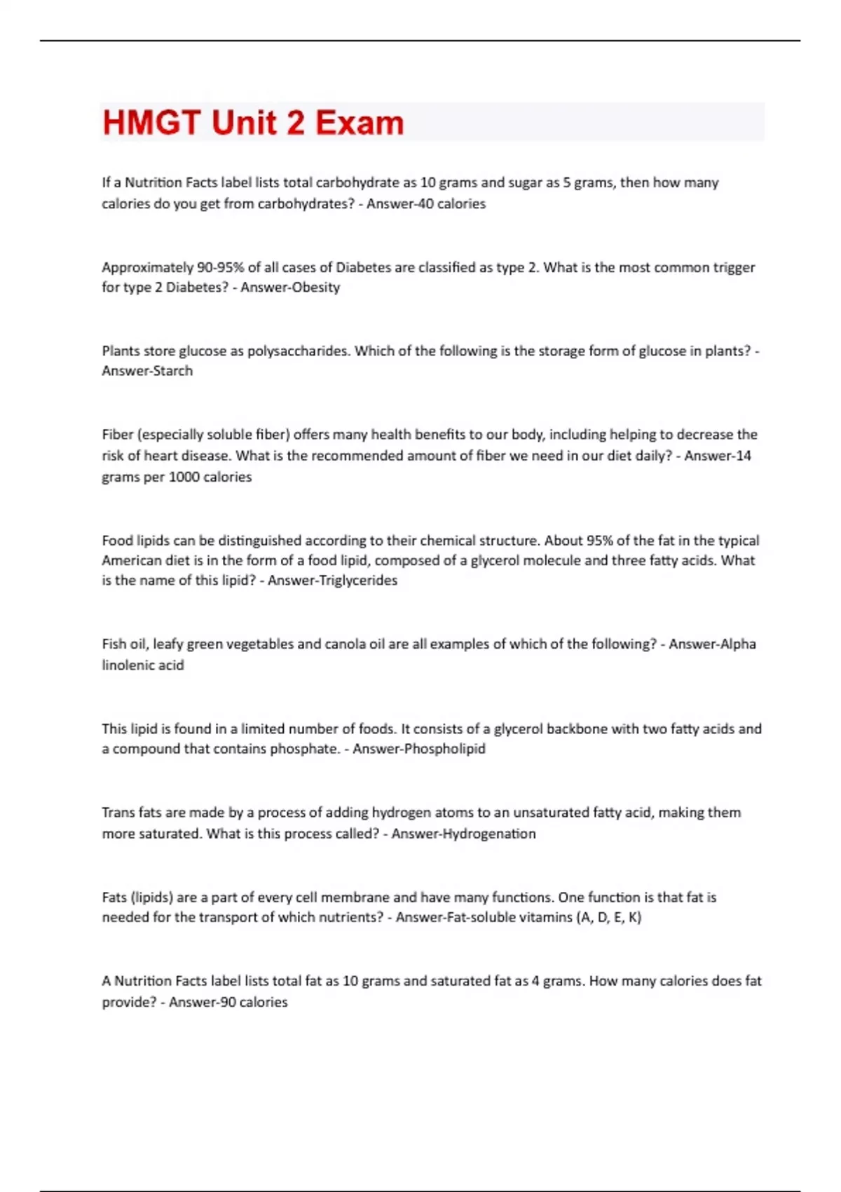 f a Nutrition Facts label lists total carbohydrate as 10 grams and sugar as 5 grams, then how many calories do you get from carbohydrates? - Answer-40 calories Approximately 90-95% of all cases of Diabetes are classified as type 2. What is the most common trigger for type 2 Diabetes? - Answer-Obesity Plants store glucose as polysaccharides. Which of the following is the storage form of glucose in plants? - Answer-Starch Fiber (especially soluble fiber) offers many health benefits to our body, including helping to decrease the risk of heart disease. What is the recommended amount of fiber we need in our diet daily? - Answer-14 grams per 1000 calories Food lipids can be distinguished according to their chemical structure. About 95% of the fat in the typical American diet is in the form of a food lipid, composed of a glycerol molecule and three fatty acids. What is the name of this lipid? - Answer-Triglycerides Fish oil, leafy green vegetables and canola oil are all examples of which of the following? - Answer-Alpha linolenic acid This lipid is found in a limited number of foods. It consists of a glycerol backbone with two fatty acids and a compound that contains phosphate. - Answer-Phospholipid Trans fats are made by a process of adding hydrogen atoms to an unsaturated fatty acid, making them more saturated. What is this process called? - Answer-Hydrogenation Fats (lipids) are a part of every cell membrane and have many functions. One function is that fat is needed for the transport of which nutrients? - Answer-Fat-soluble vitamins (A, D, E, K) A Nutrition Facts label lists total fat as 10 grams and saturated fat as 4 grams. How many calories does fat provide? - Answer-90 caloriesMonosaccharides consist of a single sugar molecule. Which of the following are monosaccharides? - Answer-Glucose, fructose, galactose Research has shown that a diet high in this fat, along with trans fats, can increase the risk of cardiovascular disease. - Answer-Saturated fat Lipoproteins play a major role in cardiovascular disease due to the proportion of lipid to protein. Which lipoprotein is also referred to as "bad cholesterol"? - Answer-LDL (low density lipoprotein) Most dietary fat is absorbed in the enterocytes with the help of micelles. In what organ does this occur? - Answer-Small intestine Which lifestyle choice can best help prevent or control cardiovascular disease (heart disease)? - AnswerDecrease saturated fat intake to less than 7% of total calories Essential fatty acids must be consumed in the diet because they cannot be made by our bodies. Which of the following are essential fatty acids? - Answer-Omega-3 and omega-6 fatty acids