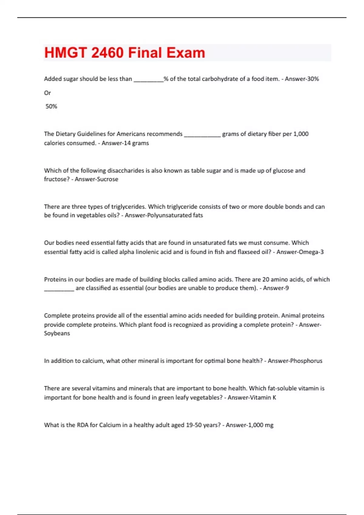 Added sugar should be less than _________% of the total carbohydrate of a food item. - Answer-30% Or 50% The Dietary Guidelines for Americans recommends ___________ grams of dietary fiber per 1,000 calories consumed. - Answer-14 grams Which of the following disaccharides is also known as table sugar and is made up of glucose and fructose? - Answer-Sucrose There are three types of triglycerides. Which triglyceride consists of two or more double bonds and can be found in vegetables oils? - Answer-Polyunsaturated fats Our bodies need essential fatty acids that are found in unsaturated fats we must consume. Which essential fatty acid is called alpha linolenic acid and is found in fish and flaxseed oil? - Answer-Omega-3 Proteins in our bodies are made of building blocks called amino acids. There are 20 amino acids, of which _________ are classified as essential (our bodies are unable to produce them). - Answer-9 Complete proteins provide all of the essential amino acids needed for building protein. Animal proteins provide complete proteins. Which plant food is recognized as providing a complete protein? - AnswerSoybeans In addition to calcium, what other mineral is important for optimal bone health? - Answer-Phosphorus There are several vitamins and minerals that are important to bone health. Which fat-soluble vitamin is important for bone health and is found in green leafy vegetables? - Answer-Vitamin K What is the RDA for Calcium in a healthy adult aged 19-50 years? - Answer-1,000 mgUsing the above Nutrition Facts, how many grams are in one cup? Serving Size: 1 cup (85 grams) - Answer-85 grams Using the above Nutrition Facts, how many calories are in the whole package? Servings per container: 3 Calories: 370 - Answer-1110 Calories (370 x 3) Using the above Nutrition Facts, how many calories are in two servings? Calories: 370 - Answer-740 Calories (370 x 2) Using the above Nutrition Facts, how many grams of fat are in two servings? Total Fat 4.0 g - Answer-8 (4 x 2) Using the above Nutrition Facts, how many grams of sodium are in one cup? Sodium 720 mg - Answer-.72 grams (Convert mg to g) Using the above Nutrition Facts, how many calories are provided by carbohydrate in one serving? Total Carbohydrate 70 g - Answer-280 Calories (Carbs x 4) Using the above Nutrition Facts, how many calories are provided by protein in one serving? Protein 16 g - Answer-64 Calories (Protein x 4)Using the above Nutrition Facts, how many calories are provided by fat in one serving? Total Fat 4.0 g - Answer-36 Calories (Fat x 9) Using the above Nutrition Facts, what percentage of the total carbohydrate is sugar? Total Carbohydrate 70 g Sugars 10 g - Answer-14.29% (10 / 70) Using the above Nutrition Facts, one serving of this food is what percentage of a 2,000 calorie diet? Calories: 370 - Answer-18.5% (370 / 2000) Abby is about to graduate from college and has decided to make some positive diet changes. She learned to read Nutrition Facts on food labels while taking a nutrition class. She also learned that Nutrition Facts can be used to build a healthy diet. Discuss ways that Abby could use Nutrition Facts on food labels to make wiser food choices and eat a healthier diet. - Answer--Keep these low: saturated fats, trans fats, cholesterol, and sodium -Get enough of these: potassium, fiber, vitamins A and C, calcium, and iron -Use the Percent Daily Value (% DV) column when possible; 5% DV or less is low, 20% DV or more is high Balance, moderation and variety are three words that can be used to describe a healthy diet. - AnswerTrue