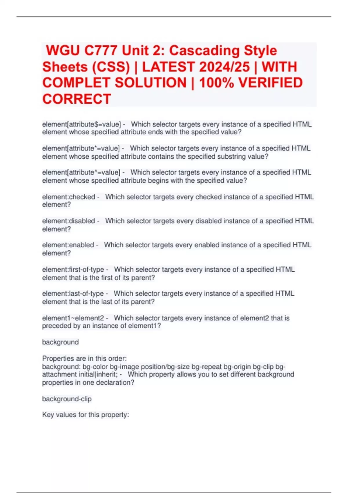 WGU C777 Unit 2: Cascading Style Sheets (CSS) | LATEST 2024/25 | WITH COMPLET SOLUTION | 100% VERIFIED CORRECT