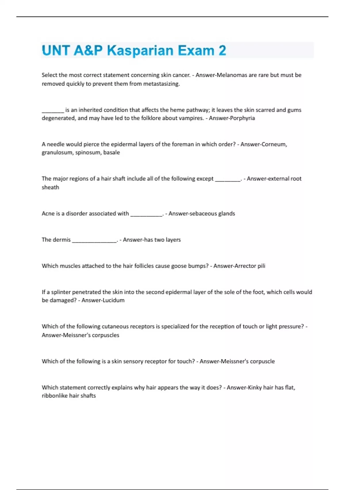 Select the most correct statement concerning skin cancer. - Answer-Melanomas are rare but must be removed quickly to prevent them from metastasizing. _______ is an inherited condition that affects the heme pathway; it leaves the skin scarred and gums degenerated, and may have led to the folklore about vampires. - Answer-Porphyria A needle would pierce the epidermal layers of the foreman in which order? - Answer-Corneum, granulosum, spinosum, basale The major regions of a hair shaft include all of the following except ________. - Answer-external root sheath Acne is a disorder associated with __________. - Answer-sebaceous glands The dermis ______________. - Answer-has two layers Which muscles attached to the hair follicles cause goose bumps? - Answer-Arrector pili If a splinter penetrated the skin into the second epidermal layer of the sole of the foot, which cells would be damaged? - Answer-Lucidum Which of the following cutaneous receptors is specialized for the reception of touch or light pressure? - Answer-Meissner's corpuscles Which of the following is a skin sensory receptor for touch? - Answer-Meissner's corpuscle Which statement correctly explains why hair appears the way it does? - Answer-Kinky hair has flat, ribbonlike hair shaftsSudoriferous glands vary in distribution over the surface of the body. Which of the following is correct? - Answer-Ceruminous glands secrete cerumen, which is thought to deter insects Although the integument is a covering, it is by no means simple, and some of its functions include ________________. - Answer-resident macrophage-like cells whose functions is to ingest antigenic invaders and present them to the immune system The function of the root hair plexus is to __________. - Answer-allow the hair to assist in touch sensation Vernix caseosa is a _______________. - Answer-whitish material produced by fetal sebaceous glands The ________ gland is a modified sudoriferous gland that secretes wax. - Answer-ceruminous Nutrients reach the surface of the skin (epidermis) through the process of _________. - Answer-diffusing through the tissue fluid from blood vessels in the dermis The reason the hypodermis acts as a shock absorber is that __________. - Answer-the major part of its makeup is adipose, which serves as an effective shock absorber Which type of skin cancer appears as a scaly reddened papule and tends to grow rapidly and metastasize? - Answer-Squamous cell carcinoma Keratinocytes are an important epidermal cell because they _________. - Answer-produce a fibrous protein that gives the skin much of its protective properties Melanocytes and keratinocytes work together in protecting the skin from UV damage when keratinocytes ____________. - Answer-accumulate the melanin granules on their superficial portion, forming a UV-blocking pigment layer The epidermis consists of five layers of cells, each layer with a distinct role to play in the health, wellbeing, and functioning of the skin. Which of the following layers is responsible for cell division and replacement? - Answer-stratum basaleThe integumentary system is protected by the action of cells that arise from bone marrow and migrate to the epidermis. Which of the following cells serve this function? - Answer-macrophages called epidermal dendritic cells Water loss through the epidermis could cause a serious threat to health and well-being. Which of the following protects us against excessive water loss through the skin? - Answer-Lamellated granules of the cells of the stratum granulosum, a glycolipid that is secreted into extracellular spaces. The dermis is a strong, flexible connective tissue layer. Which of the following cell types are likely to be found in the dermis? - Answer-fibroblasts, macrophages, and mast cells