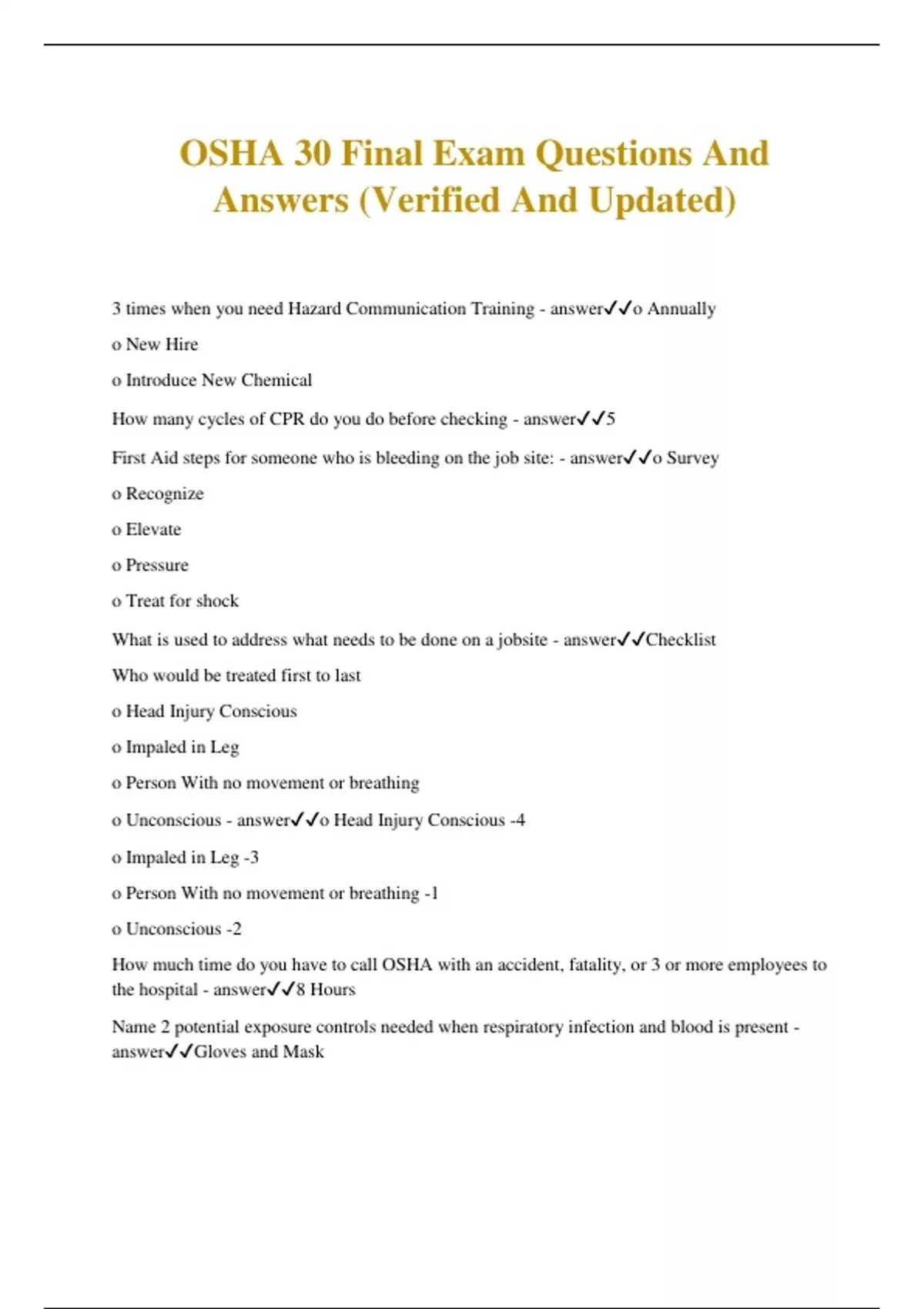 OSHA 30 Final Exam Questions And Answers (Verified And Updated) 3 times when you need Hazard Communication Training - answero Annually o New Hire o Introduce New Chemical How many cycles of CPR do you do before checking - answer5 First Aid steps for someone who is bleeding on the job site: - answero Survey o Recognize o Elevate o Pressure o Treat for shock What is used to address what needs to be done on a jobsite - answerChecklist Who would be treated first to last o Head Injury Conscious o Impaled in Leg o Person With no movement or breathing o Unconscious - answero Head Injury Conscious -4 o Impaled in Leg -3 o Person With no movement or breathing -1 o Unconscious -2 How much time do you have to call OSHA with an accident, fatality, or 3 or more employees to the hospital - answer8 Hours Name 2 potential exposure controls needed when respiratory infection and blood is present - answerGloves and Mask