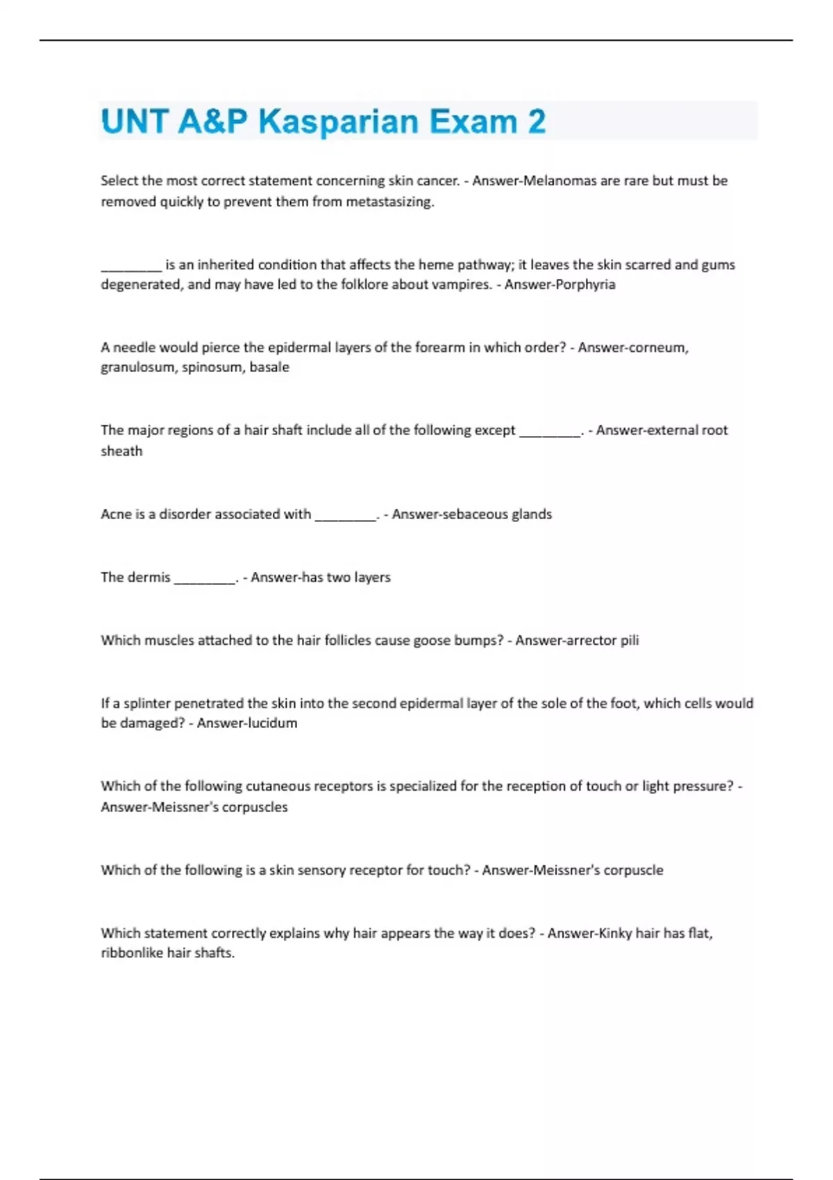 Select the most correct statement concerning skin cancer. - Answer-Melanomas are rare but must be removed quickly to prevent them from metastasizing. ________ is an inherited condition that affects the heme pathway; it leaves the skin scarred and gums degenerated, and may have led to the folklore about vampires. - Answer-Porphyria A needle would pierce the epidermal layers of the forearm in which order? - Answer-corneum, granulosum, spinosum, basale The major regions of a hair shaft include all of the following except ________. - Answer-external root sheath Acne is a disorder associated with ________. - Answer-sebaceous glands The dermis ________. - Answer-has two layers Which muscles attached to the hair follicles cause goose bumps? - Answer-arrector pili If a splinter penetrated the skin into the second epidermal layer of the sole of the foot, which cells would be damaged? - Answer-lucidum Which of the following cutaneous receptors is specialized for the reception of touch or light pressure? - Answer-Meissner's corpuscles Which of the following is a skin sensory receptor for touch? - Answer-Meissner's corpuscle Which statement correctly explains why hair appears the way it does? - Answer-Kinky hair has flat, ribbonlike hair shafts.Sudoriferous glands vary in distribution over the surface of the body. Which of the following is correct? - Answer-Ceruminous glands secrete cerumen, which is thought to deter insects. Although the integument is a covering, it is by no means simple, and some of its functions include ________. - Answer-resident macrophage-like cells whose function is to ingest antigenic invaders and present them to the immune system The function of the root hair plexus is to ________. - Answer-allow the hair to assist in touch sensation Vernix caseosa is a ________. - Answer-whitish material produced by fetal sebaceous glands The ________ gland is a modified sudoriferous gland that secretes wax. - Answer-ceruminous Nutrients reach the surface of the skin (epidermis) through the process of ________. - Answer-diffusing through the tissue fluid from blood vessels in the dermis The reason the hypodermis acts as a shock absorber is that ________. - Answer-the major part of its makeup is adipose, which serves as an effective shock absorber Which type of skin cancer appears as a scaly reddened papule and tends to grow rapidly and metastasize? - Answer-Squamous cell carcinoma Keratinocytes are an important epidermal cell because they ________. - Answer-produce a fibrous protein that gives the skin much of its protective properties Melanocytes and keratinocytes work together in protecting the skin from UV damage when keratinocytes ________. - Answer-accumulate the melanin granules on their superficial portion, forming a UV-blocking pigment layer The epidermis consists of five layers of cells, each layer with a distinct role to play in the health, wellbeing, and functioning of the skin. Which of the following layers is responsible for cell division and replacement? - Answer-stratum basaleThe integumentary system is protected by the action of cells that arise from bone marrow and migrate to the epidermis. Which of the following cells serve this function? - Answer-macrophages called epidermal dendritic cells Water loss through the epidermis could cause a serious threat to health and well-being. Which of the following protects us against excessive water loss through the skin? - Answer-Lamellated granules of the cells of the stratum granulosum, a glycolipid that is secreted into extracellular spaces. The dermis is a strong, flexible connective tissue layer. Which of the following cell types are likely to be found in the dermis? - Answer-fibroblasts, macrophages, and mast cells