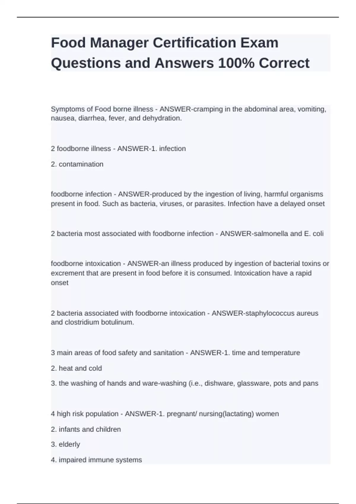 Food Manager Certification Exam Questions and Answers 100% Correct