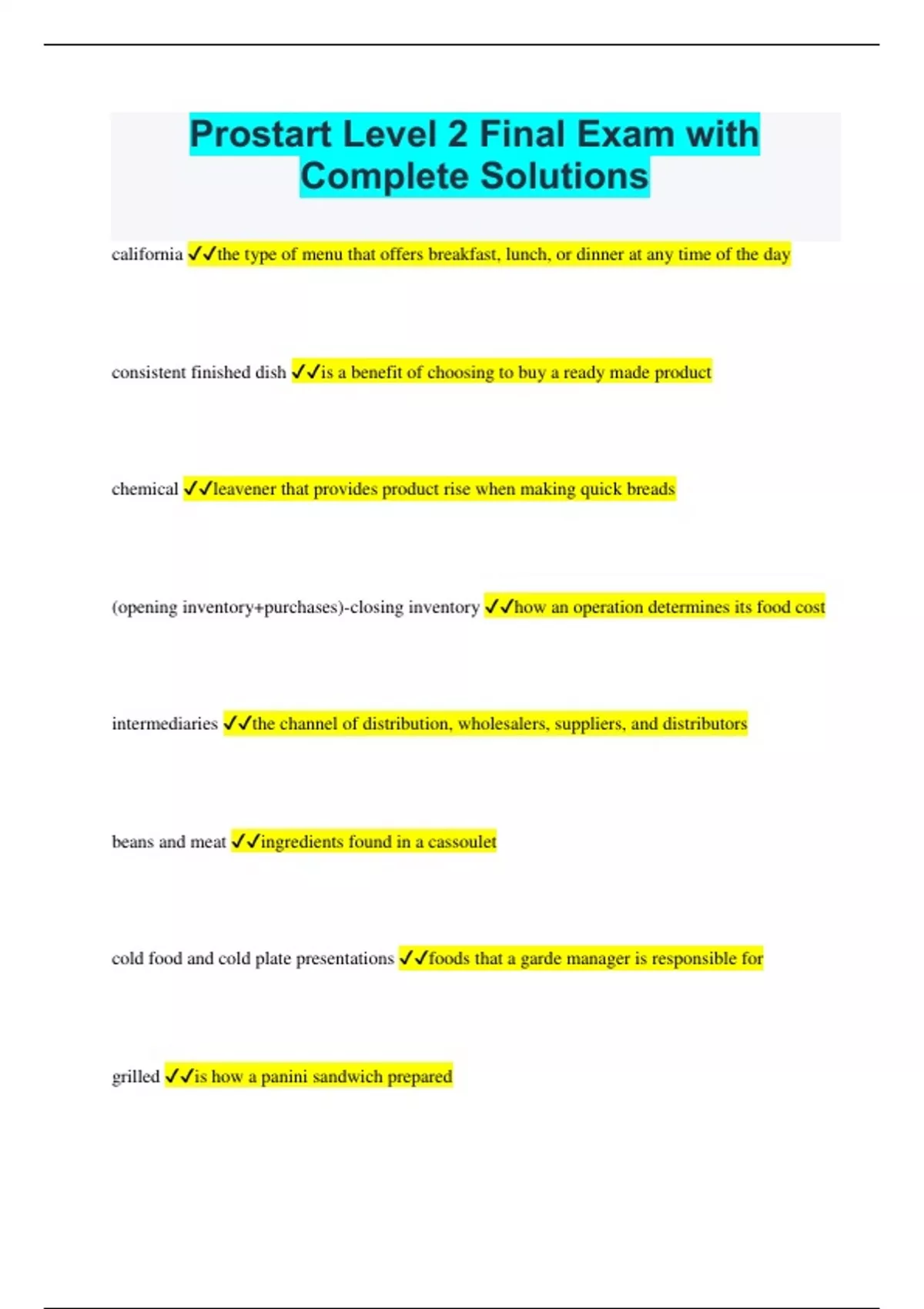 Prostart Level 2 Final Exam with Complete Solutions california the type of menu that offers breakfast, lunch, or dinner at any time of the day consistent finished dish is a benefit of choosing to buy a ready made product chemical leavener that provides product rise when making quick breads (opening inventory+purchases)-closing inventory how an operation determines its food cost intermediaries the channel of distribution, wholesalers, suppliers, and distributors beans and meat ingredients found in a cassoulet cold food and cold plate presentations foods that a garde manager is responsible for grilled is how a panini sandwich prepared cooked pastas primary ingredients in a bound salad item food cost divided by food cost precentage food percentage formula poaching cooking method that is best for very lean meats fat item that makes baked goods moist and keep them fresh longer composing process of breaking down organic material to form fertilizer accompaniment a small amount of potato salad would be appropriate as which type of salad (desired yield divided by original yield) x each ingredient amount decreasing a recipe yield formula home fried the traditional form of cooking breakfast potatoes that are shredded or chopped raw allowances need to be made for waste, employee meals, and promotions why the cost of food NOT equal the cost of actual sold food base, body, garnish, and dressing four parts of a salad sales and costs compilation of profit and loss report skim, whole, condensed, half & half,