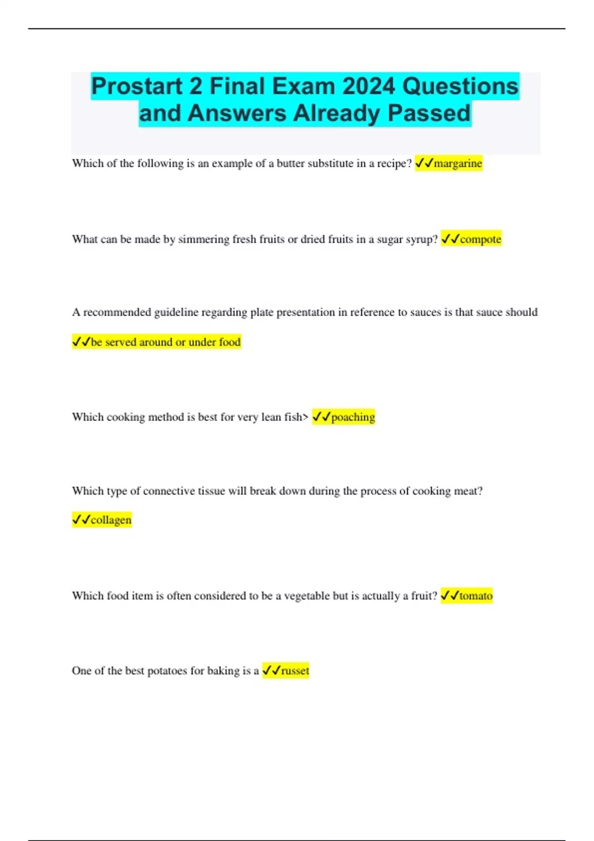 Prostart 2 Final Exam 2024 Questions and Answers Already Passed Which of the following is an example of a butter substitute in a recipe? margarine What can be made by simmering fresh fruits or dried fruits in a sugar syrup? compote A recommended guideline regarding plate presentation in reference to sauces is that sauce should be served around or under food Which cooking method is best for very lean fish> poaching Which type of connective tissue will break down during the process of cooking meat? collagen Which food item is often considered to be a vegetable but is actually a fruit? tomato One of the best potatoes for baking is a russet Emailing information to college students about the coffee shop on campus is an example of direct marketing Lean doughs contain very little or no sugar and fat What is the required internal temperature that poultry stuffing must reach? 155*F Employees covered under the FLSA who must be paid a minimum wage and overtime for working over 40 hours are classified as non-exempt Vanilla sauce, gelatin, and whipped cream are combined to make which dessert filing? bavarian cream A restaurant uses the food cost percentage method to price its menu. With a food cost percentage of 30% for each dish, what should the menu price be for an entree with a raw food cost fo $4.00? 13.33 The process of breaking down organic material to form fertilizer is known as composting Which process is used to remove harmful bacteria from milk? pasteurization Which mixing method is used to prepare a high ratio cake two-stage Which of the following costs are most impacted by business volume labor What are the main ingredients in ganache? chocolate and cream Which type of legume is most often used to prepare hummus? garbanzo Most recipes are based on which size of egg? large Which kind of chicken meat is low in calories and fat content? white Using the food cost percentage method, which item would be divided by the food cost in order to calculate menu price? food cost percentage What does the term "natural" mean when applied to fresh produce? the term is legally meaningless Which type of training ensures that all employees receive the same information? group Employees learn how to perform the duties of another