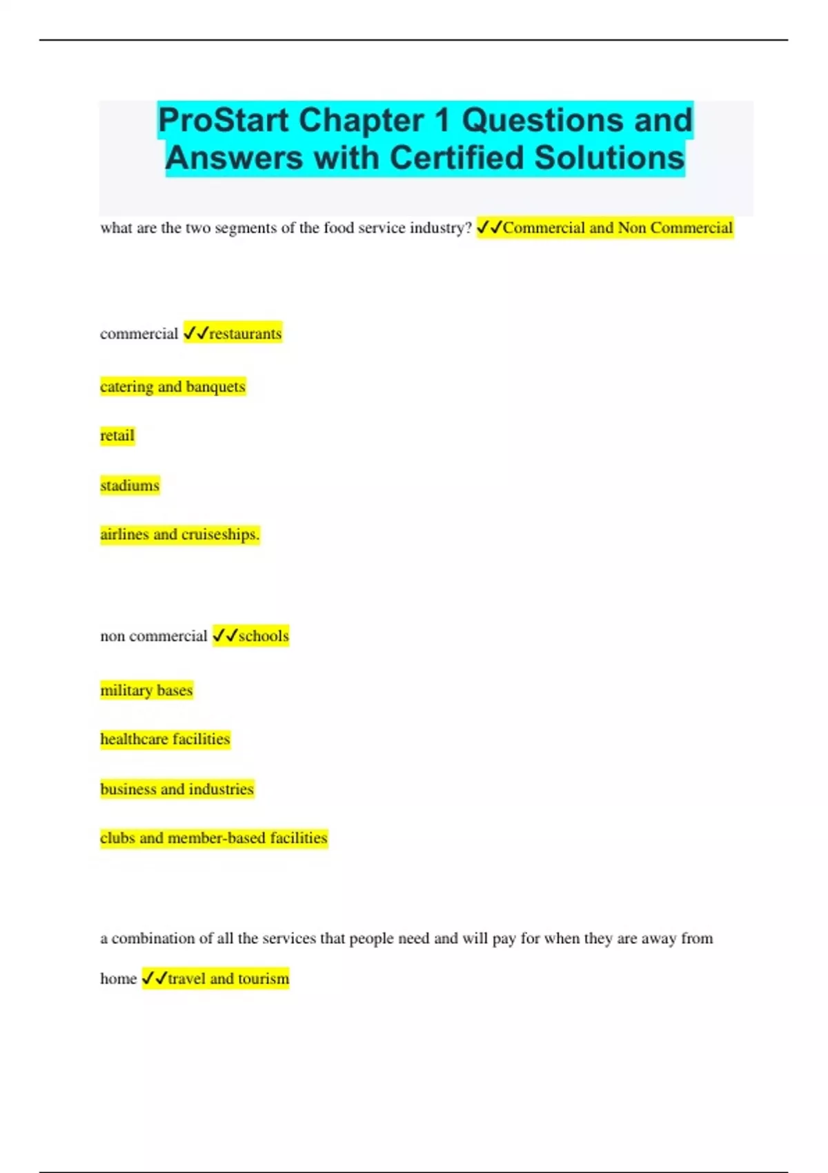 ProStart Chapter 1 Questions and Answers with Certified Solutions what are the two segments of the food service industry? Commercial and Non Commercial commercial restaurants catering and banquets retail stadiums airlines and cruiseships. non commercial schools military bases healthcare facilities business and industries clubs and member-based facilities a combination of all the services that people need and will pay for when they are away from home travel and tourism the services that people use and receive when they are away from home hospitality travel from recreational, leisure, or business purposes, and it has become a popular global leisure activity tourism what are the six forms of the transportation listed in the book. airplanes trains charter services buses cars ships a consumer-based guide that rates restaurants on four quilities: food, décor, service, and cost. Zagat Survey a rating system better known in Europe, but it hs recently begun rating organizations in the United states and elsewhere. Michelin Guide provide food service for everything from special events in private homes to large-scale events such as golf tournaments, weddings, or corporate dinners. catering opportunities are found in businesses that offer home meal replacement and ready-made dishes. Retail foodservice is provided by servers, walking vendors, cooks, and cashiers. Stadiums the worldwide food Expo is the largest food and beverage technology event in North America. Convention Centers Foodservice ranges from quick-service to fine-dining. National and State Parks Quality of food and service is no less important in this setting than it is in a free-standing restaurant. Theme Parks offer a variety of food service oppurtunities that include quick-service and casual-dining restaurants. Shopping