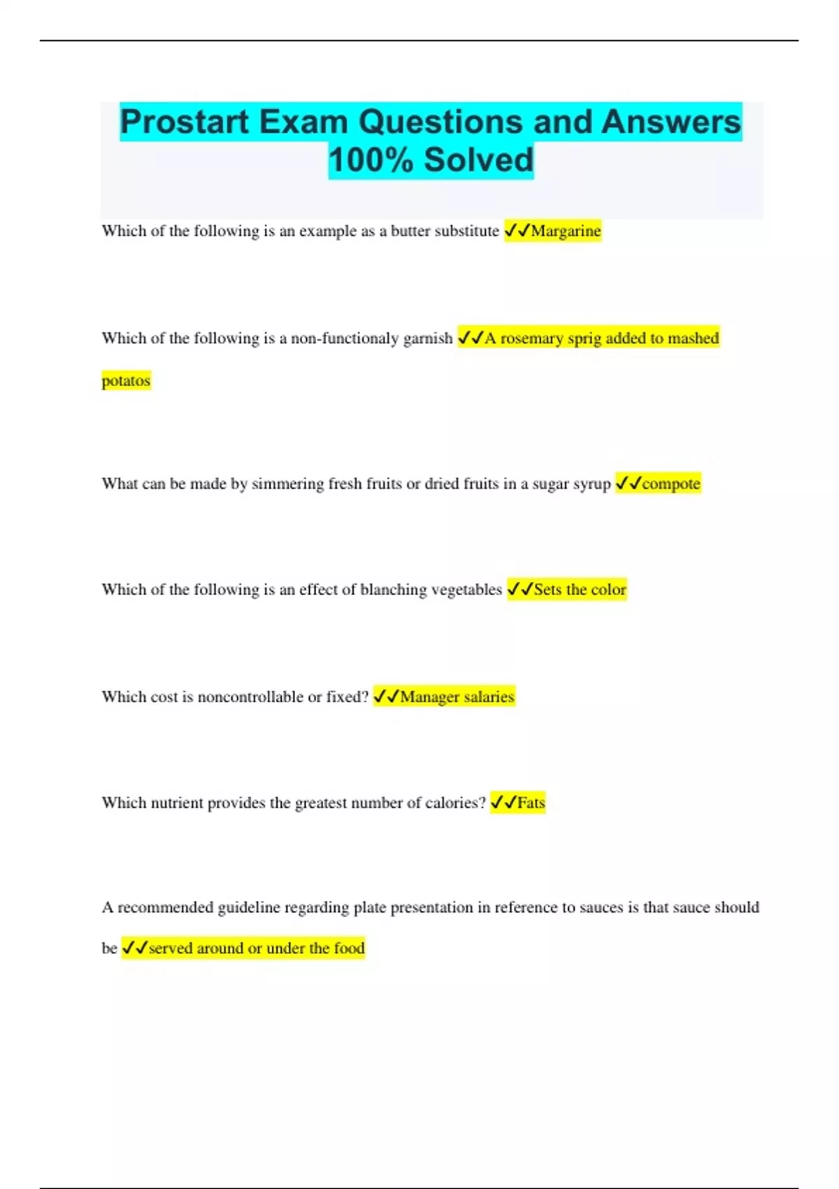Prostart Exam Questions and Answers 100% Solved Which of the following is an example as a butter substitute Margarine Which of the following is a non-functionaly garnish A rosemary sprig added to mashed potatos What can be made by simmering fresh fruits or dried fruits in a sugar syrup compote Which of the following is an effect of blanching vegetables Sets the color Which cost is noncontrollable or fixed? Manager salaries Which nutrient provides the greatest number of calories? Fats A recommended guideline regarding plate presentation in reference to sauces is that sauce should be served around or under the food Which cooking method is best for very lean fish? poaching TO accurately be labeled ice cream is must contain what milk far percent? 8% Which type of connective tissue will break down during the process of cooking meat? collagen Which type of forecast uses the number of expected guests to determine purchasing needs? Customer Count Which food item is often considered a vegetable but is actually a fruit? Tomato Which potato is the standard baking potato Russet Emailing information to college students about the coffee shop on campus is an example of direct marketing which is the best method for preserving the nutrients in green vegetables during cooking? Steaming or stir-frying Lean doughs contain very little or no sugar and fat what is the defining factor in heavy cream? fat What is the required internal temperature that poultry stuffing must reach? 165F Which type of rice is used for risotto? Arborio Employees covered by the Fair labor standards act (FLSA) who must be paid minimum wage and overtime for working 40 hours per week are classified as non-excempt which of the following plans help the operation remain efficient during adverse conditions such as a power outage? Contingency