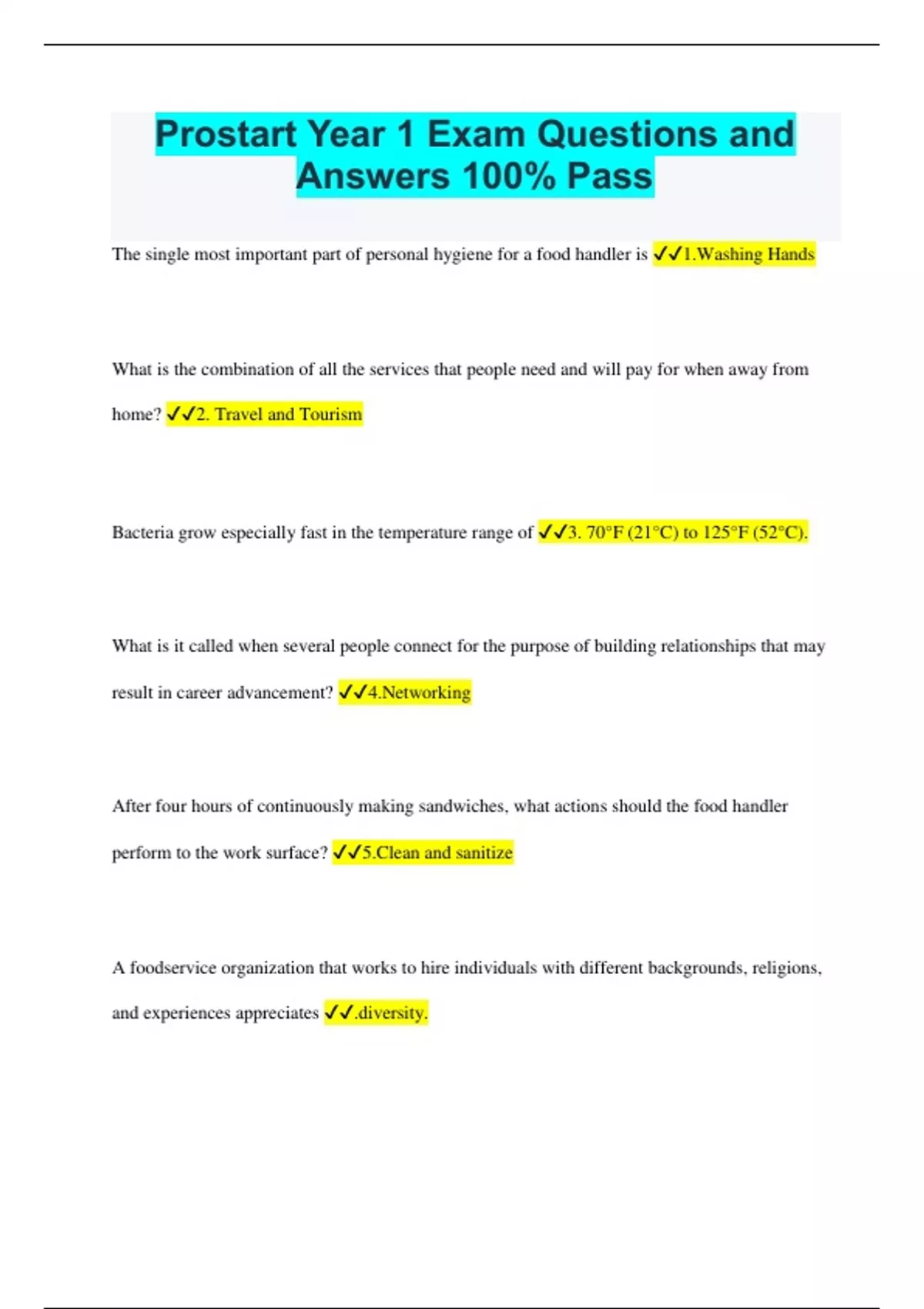 Prostart Year 1 Exam Questions and Answers 100% Pass The single most important part of personal hygiene for a food handler is 1.Washing Hands What is the combination of all the services that people need and will pay for when away from home? 2. Travel and Tourism Bacteria grow especially fast in the temperature range of 3. 70°F (21°C) to 125°F (52°C). What is it called when several people connect for the purpose of building relationships that may result in career advancement? 4.Networking After four hours of continuously making sandwiches, what actions should the food handler perform to the work surface? 5.Clean and sanitize A foodservice organization that works to hire individuals with different backgrounds, religions, and experiences appreciates .diversity. Treating people fairly and holding others accountable is a example of what? Leading consistently An example of cookware with two handles used for boiling and simmering foods is the 9. Stock Pot When receiving food from a vendor, scales are used to .Confirm Order amounts Body language and gestures are which type of communication? 11.Non Verbal The factors that affect a sanitizer's effectiveness are .contact time, temperature, and concentration. The term "saucier" refers to a who specializes in making sauces. Who is primarily responsible for seating customers in a contemporary full-service operation? 14.Host/Hostess In which type of pan should scrambled eggs for a breakfast buffet be placed? 15.Hotel Which type of flour has a low gluten content? .Cake What is the formula for increasing or decreasing a recipe yield? 17.(Desired yield / Original Yield) X each ingredient How does good customer service benefit the operation? Marketing costs decrease Why doesn't the use of microwave ovens for cooking typically allow for browning? 19.There is no external heat source Which one of the following is a classical knife cut? Rondelle How is foodservice typically handled within the noncommercial segment? 21.Contract feeding and self- operators Which is a respectful way for a listener to agree with a speaker's point? .Nodding Which of the following is the PRIMARY consideration when deep- frying multiple large batches of frozen food? recovery time Which job search tool is a collection of