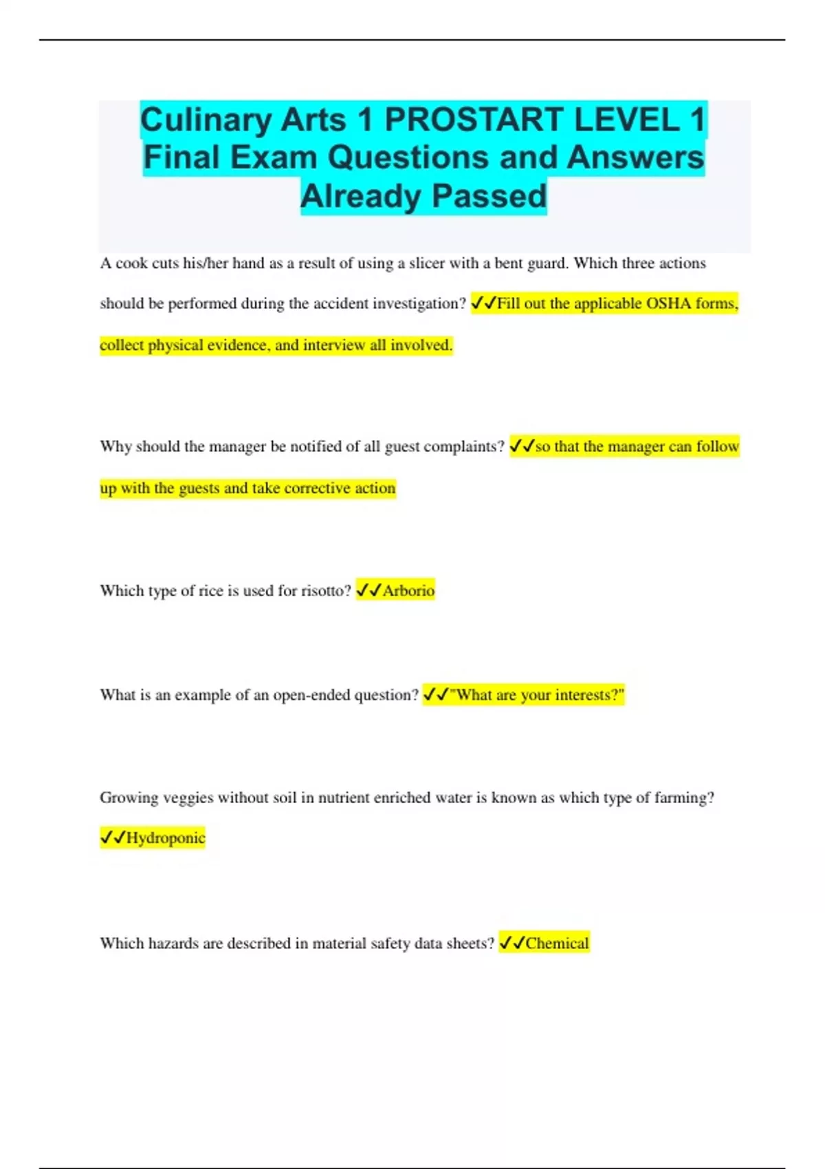 Culinary Arts 1 PROSTART LEVEL 1 Final Exam Questions and Answers Already Passed