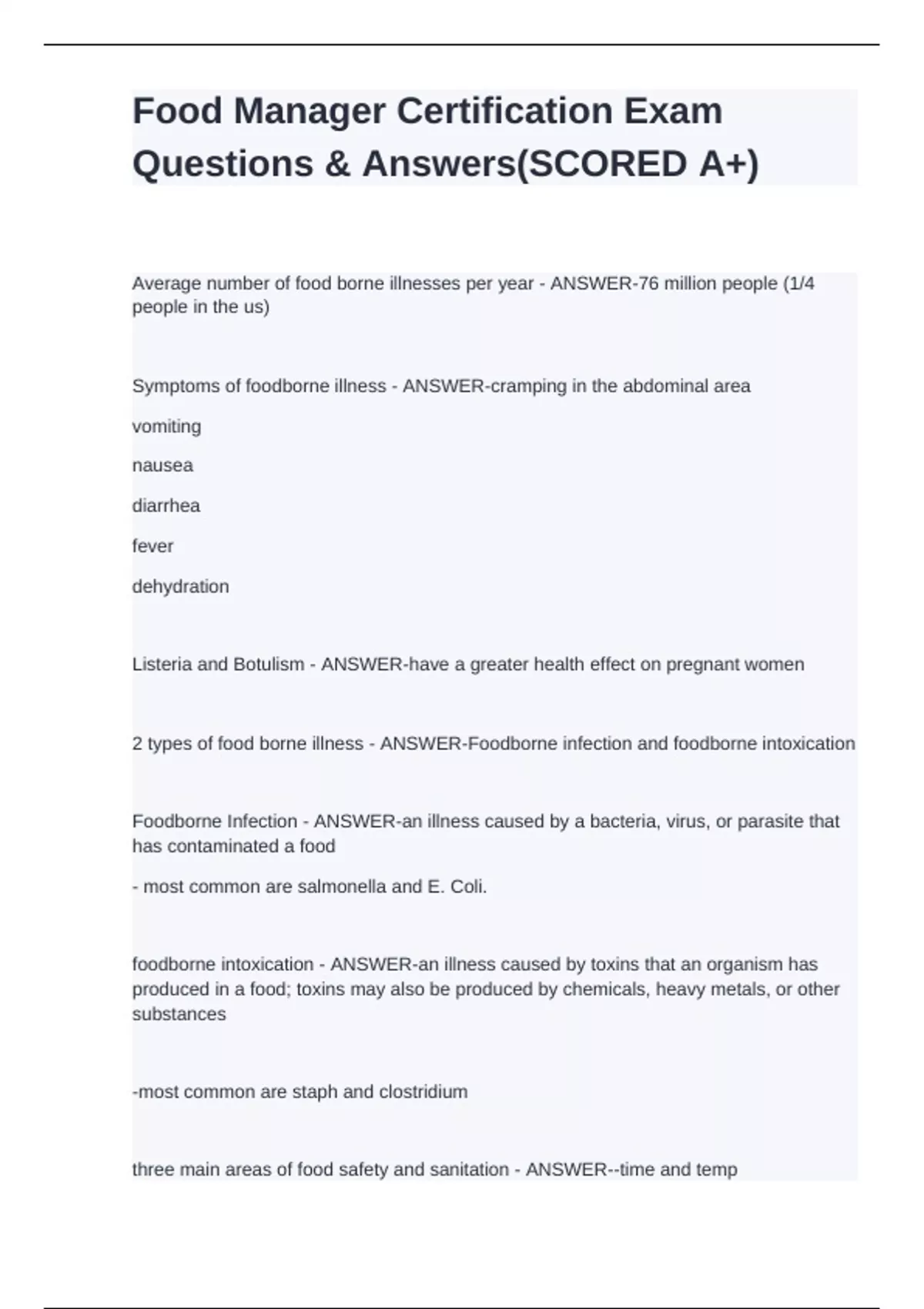 Food Manager Certification Exam Questions & Answers(SCORED A+)