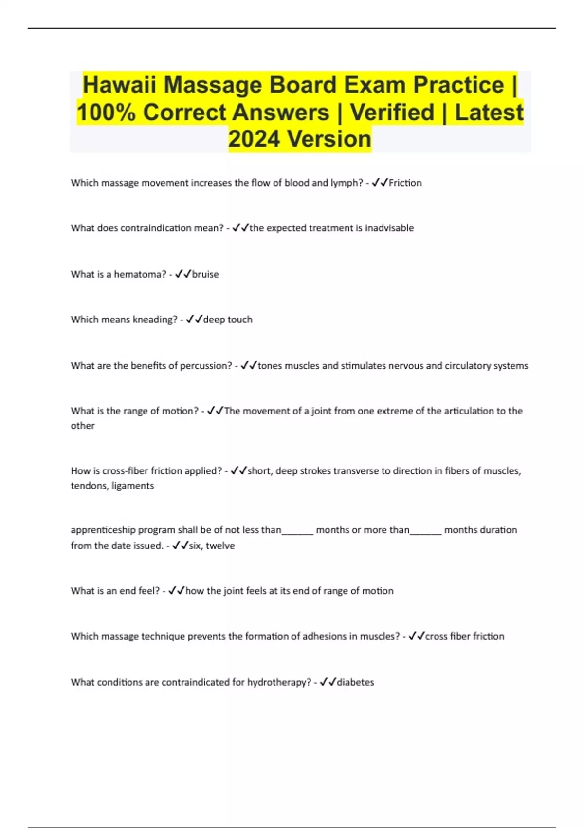 Hawaii Massage Board Exam Practice | 100% Correct Answers | Verified | Latest 2024 Version