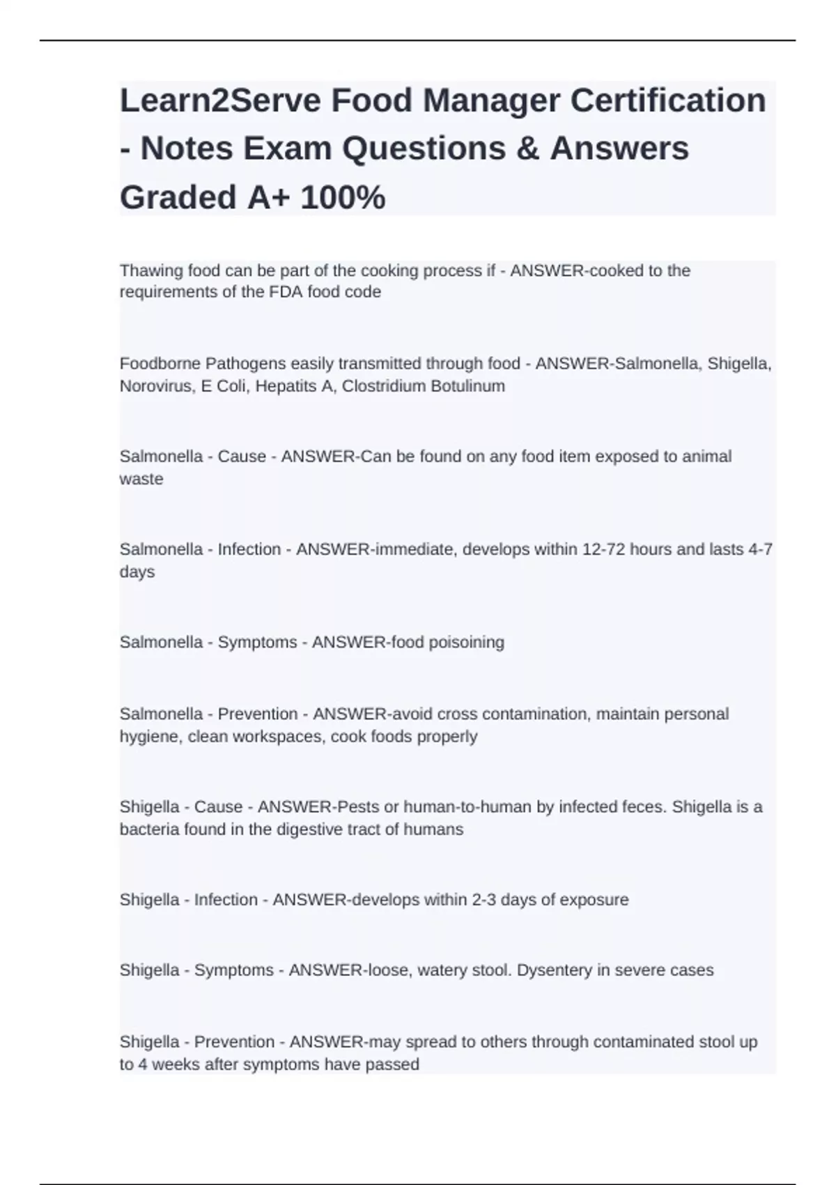 Learn2Serve Food Manager Certification - Notes Exam Questions & Answers Graded A+ 100%