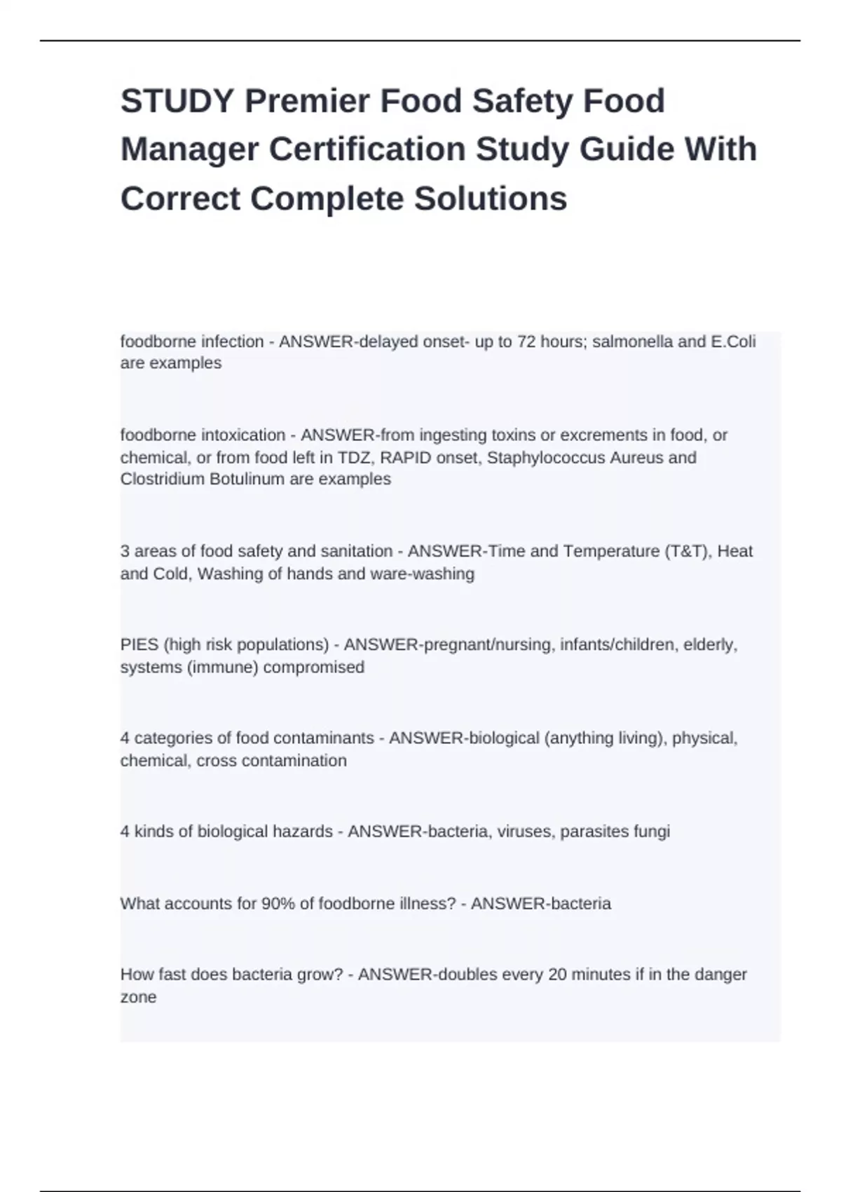 STUDY Premier Food Safety Food Manager Certification Study Guide With Correct Complete Solutions