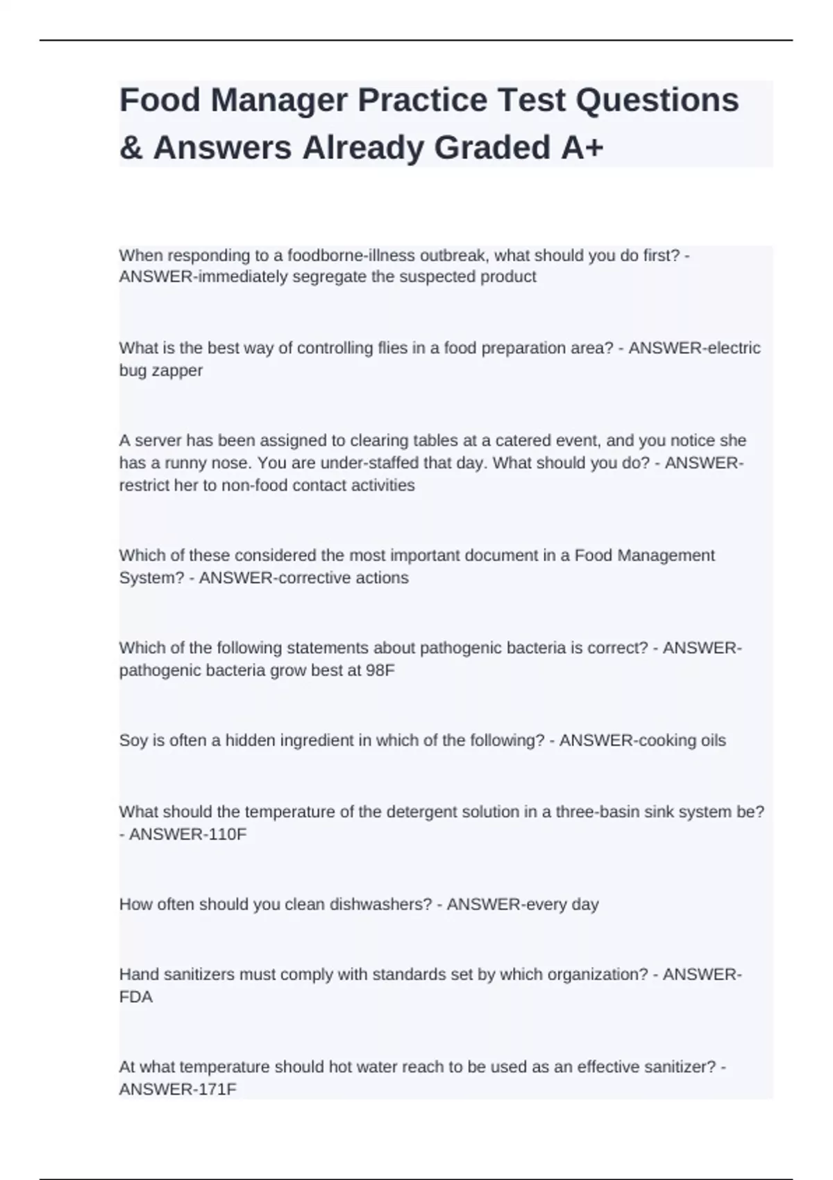 Food Manager Practice Test Questions & Answers Already Graded A+