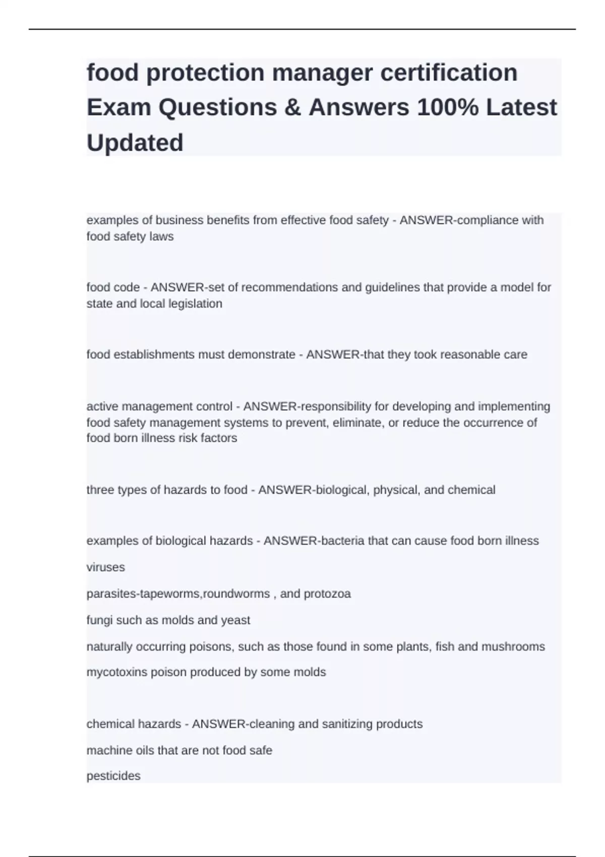 food protection manager certification Exam Questions & Answers 100% Latest Updated
