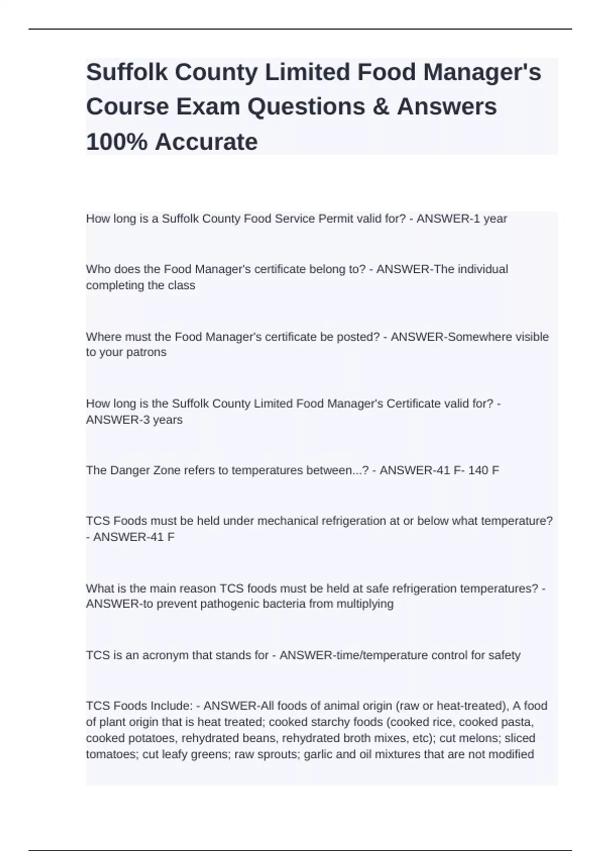 Suffolk County Limited Food Manager's Course Exam Questions & Answers 100% Accurate