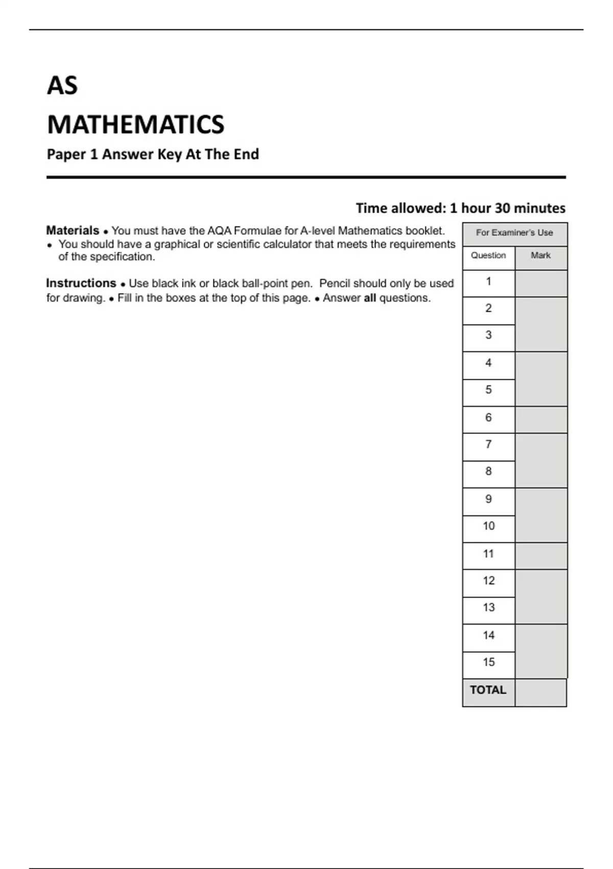 AS MATHEMATICS Paper 1Answer Key At The End
