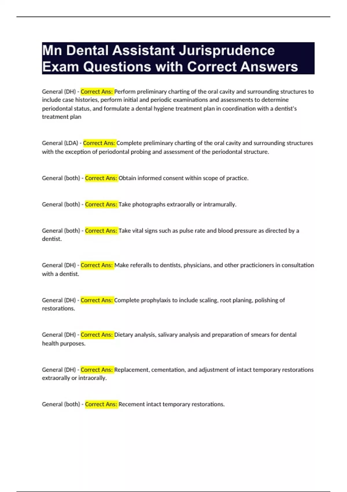 Mn Dental Assistant Jurisprudence Exam Questions with Correct Answers