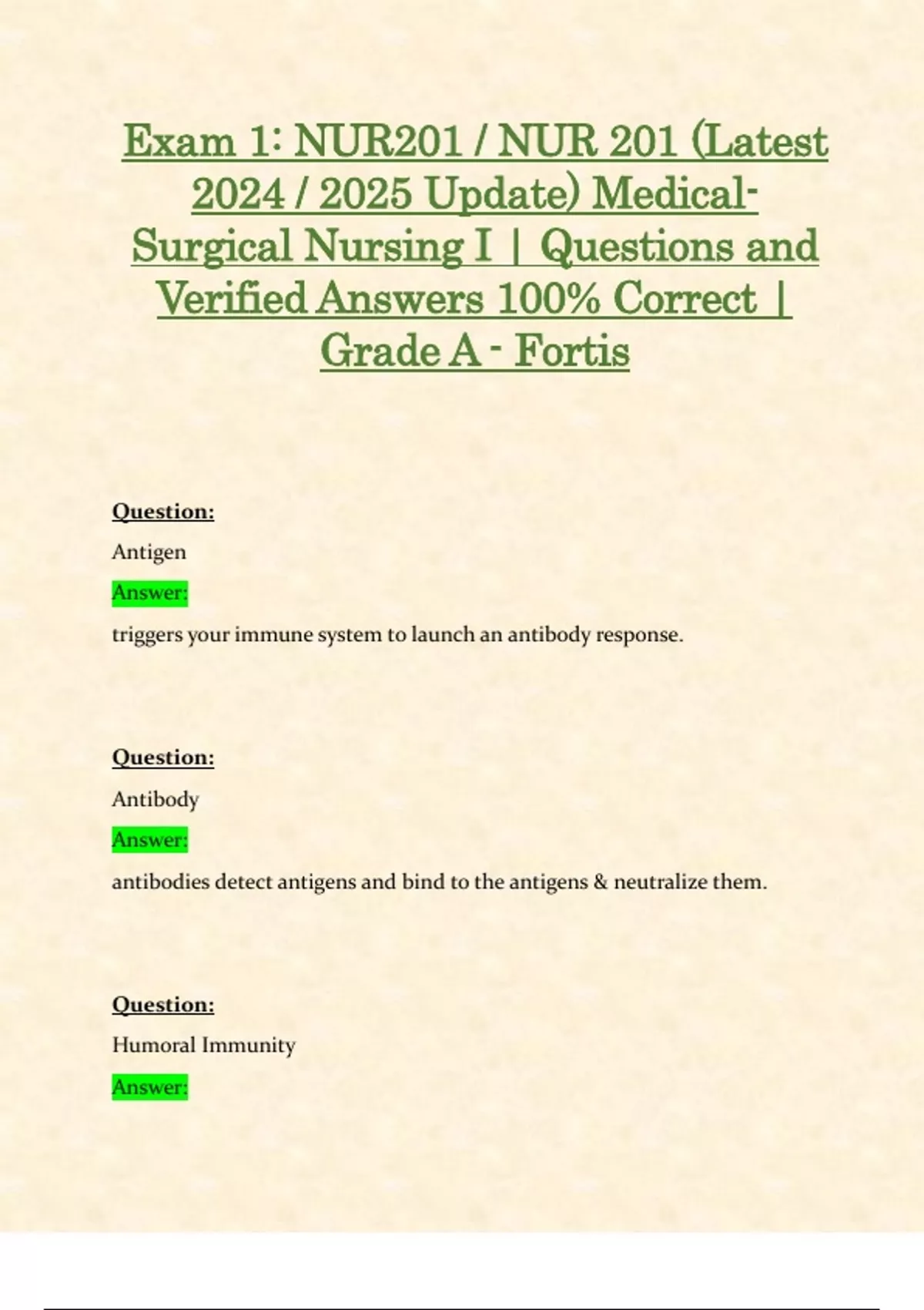 Exam 1: NUR201 / NUR 201 (Latest 2024 / 2025 Update) Medical-Surgical Nursing I | Questions and Verified Answers 100% Correct | Grade A - Fortis Question: Antigen Answer: triggers your immune system to launch an antibody response. Question: Antibody Answer: antibodies detect antigens and bind to the antigens & neutralize them. Question: Humoral Immunity Answer: Uses antibodies to produce a response Controls Extra-cellular antigens B cells Question: Cell-mediated Immunity Answer: Immune cells Controls Intra-cellular Antigens T cells Question: Hypersensitivity: Type 1 Answer: Main ones Anaphylaxis Localized or systematic Hay fever, or hives Atopic Question: Transfusion Reaction: Stage 2 Answer: Reaction to the blood you were given Question: Autoimmune: Type 3 Answer: Autoimmune reation Question: Delayed reaction: Type 4 Answer: Delayed reaction "I have used latex for ever due to being a nurse" Question: S/S of localized allergic reaction Answer: Redness Heat Pain Loss of function Runny eyes, nose Question: S/S of anaphlaxis Answer: swelling HA/dizziness Parasthesia Impending doom Pruitis Angioedema Erythema