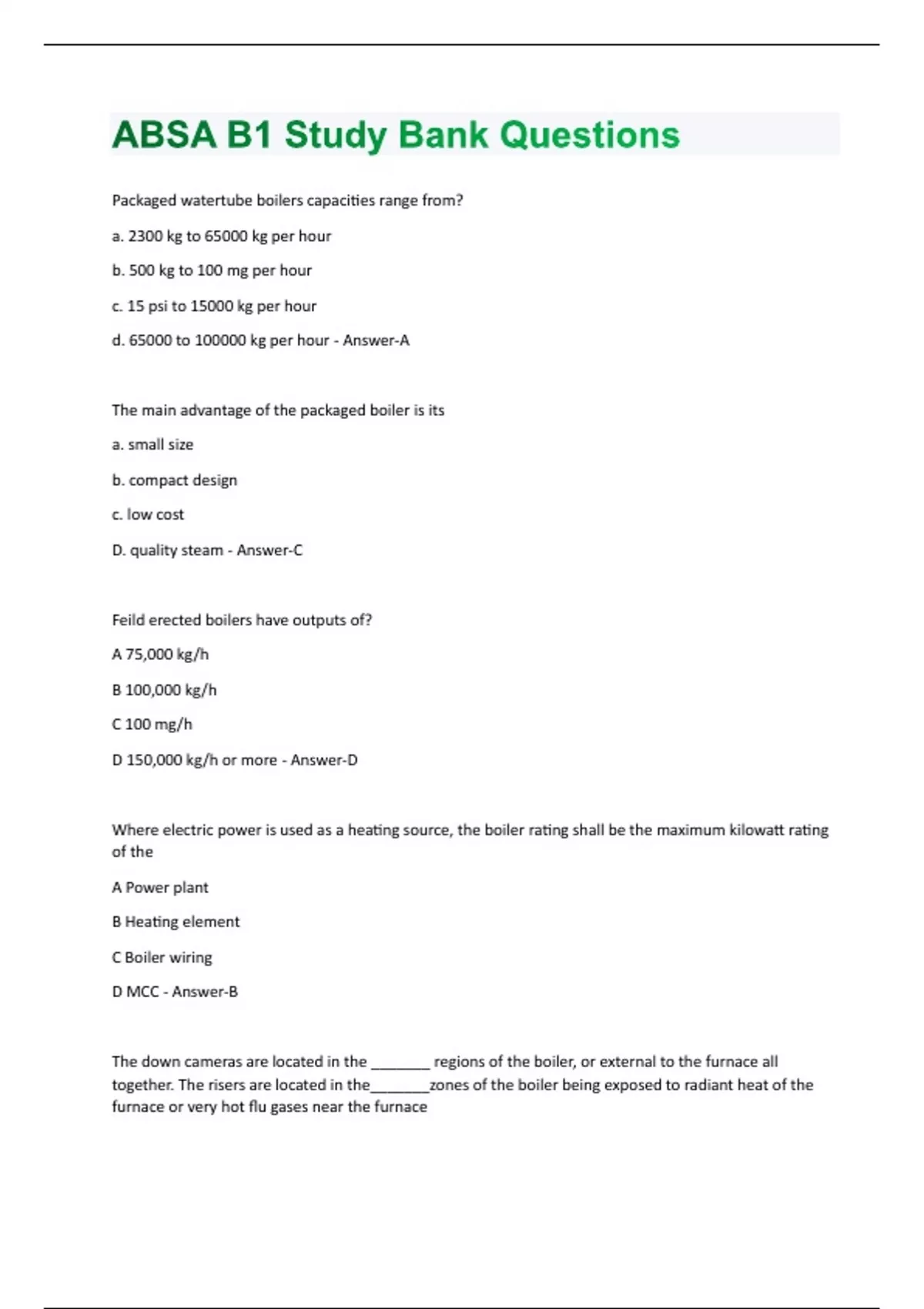 Packaged watertube boilers capacities range from? a. 2300 kg to 65000 kg per hour b. 500 kg to 100 mg per hour c. 15 psi to 15000 kg per hour d. 65000 to 100000 kg per hour - Answer-A The main advantage of the packaged boiler is its a. small size b. compact design c. low cost D. quality steam - Answer-C Feild erected boilers have outputs of? A 75,000 kg/h B 100,000 kg/h C 100 mg/h D 150,000 kg/h or more - Answer-D Where electric power is used as a heating source, the boiler rating shall be the maximum kilowatt rating of the A Power plant B Heating element C Boiler wiring D MCC - Answer-B The down cameras are located in the _______ regions of the boiler, or external to the furnace all together. The risers are located in the_______zones of the boiler being exposed to radiant heat of the furnace or very hot flu gases near the furnaceA Back, front B Cooler, hottest C Water, furnace D Drum, radiant - Answer-B The steam separating equipment separates the______ from the steam/water mixture A Water B Steam C Impurities D Water droplets - Answer-B