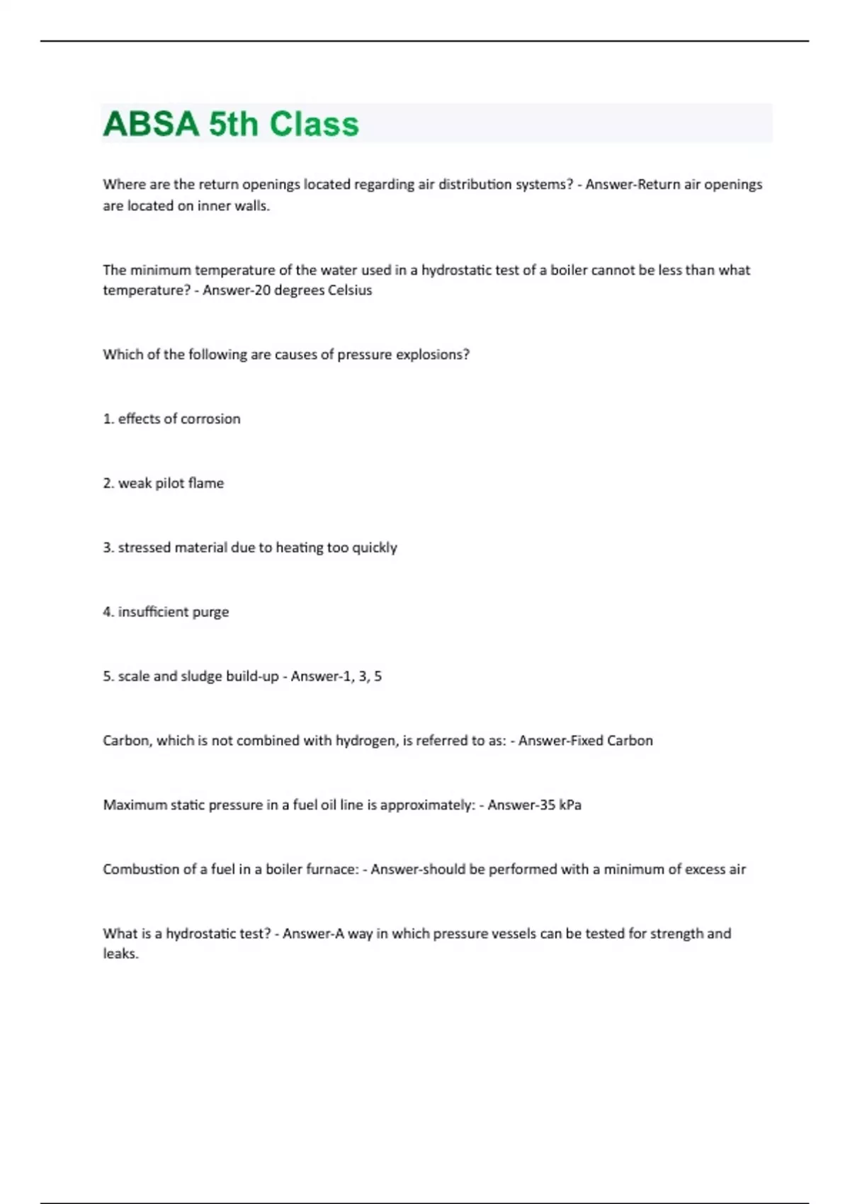 Where are the return openings located regarding air distribution systems? - Answer-Return air openings are located on inner walls. The minimum temperature of the water used in a hydrostatic test of a boiler cannot be less than what temperature? - Answer-20 degrees Celsius Which of the following are causes of pressure explosions? 1. effects of corrosion 2. weak pilot flame 3. stressed material due to heating too quickly 4. insufficient purge 5. scale and sludge build-up - Answer-1, 3, 5 Carbon, which is not combined with hydrogen, is referred to as: - Answer-Fixed Carbon Maximum static pressure in a fuel oil line is approximately: - Answer-35 kPa Combustion of a fuel in a boiler furnace: - Answer-should be performed with a minimum of excess air What is a hydrostatic test? - Answer-A way in which pressure vessels can be tested for strength and leaks.How often do burner and fan motors which uses standard bearing normally require lubrication? - Answer-Yearly On a hot water boiler, the pressure differential between the operating pressure and the safety relief valve set pressure must be (at a minimum): 1. 25% of operating pressure 2. 125% of operating pressure 3. 69 kPa 4. 25% of the safety relief valve set pressure - Answer-3, 4 In hot water boiler operation the maximum operating temperature should never exceed: - Answer-121 degrees celsius A substance, which will absorb humidity inside a boiler during dry lay up is: - Answer-Activated alumina When draft is produced by natural means: - Answer-cooler air surrounding the boiler increases draft Coal is composed of the following combustible components: - Answer-Carbon, hydrogen, Sulphur Which of the following are causes of furnace explosions? 1. main fuel valve closed when the burner flame is lost 2. insufficient purge3. burners lit from hot refractory 4. effects of corrosion 5. admission of fuel before ignition source - Answer-3,4,5 Which grade of oil is the most popular for domestic and small commercial boilers? - Answer-Grade 2 The inclined manometer as compared to the U manometer is what? - Answer-More accurate. How can the draft through a natural draft furnace be increased? - Answer-Increase the temperature of the stack The main function of a gas burner is: - Answer-provision of O2 - fuel contact The minimum distance from furnace to oil storage tank is: - Answer-2 feet One of the main component of an electric ignition system is the step-up transformer which takes 120 V and boosts it to _____ volts - Answer-10,000 - 12,000 volts. Combustion of a fuel in a boiler furnace should be performed in what conditions? - Answer-There should be a minimum of excess air. What type of oil burner is used when oil is supplied under high pressure? - Answer-Mechanical Atomizing Burner An air atomizing compressor is usually what type? - Answer-A rotary type. Which of the following advantages does oil have over coal as a boiler fuel?1. requires less storage space 2. costs less to handle 3. fuel quantity is easier to control 4. burns more cleanly - Answer-All of the above