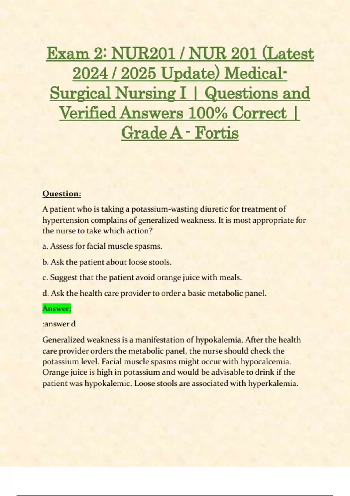 Exam 2: NUR201 / NUR 201 (Latest 2024 / 2025 Update) Medical-Surgical Nursing I | Questions and Verified Answers 100% Correct | Grade A - Fortis Question: A patient who is taking a potassium-wasting diuretic for treatment of hypertension complains of generalized weakness. It is most appropriate for the nurse to take which action? a. Assess for facial muscle spasms. b. Ask the patient about loose stools. c. Suggest that the patient avoid orange juice with meals. d. Ask the health care provider to order a basic metabolic panel. Answer: :answer d Generalized weakness is a manifestation of hypokalemia. After the health care provider orders the metabolic panel, the nurse should check the potassium level. Facial muscle spasms might occur with hypocalcemia. Orange juice is high in potassium and would be advisable to drink if the patient was hypokalemic. Loose stools are associated with hyperkalemia. Question: A patient who has been receiving diuretic therapy is admitted to the emergency department with a serum potassium level of 3.0 mEq/L. The nurse should alert the health care provider immediately that the patient is on which medication? a. Oral digoxin (Lanoxin) 0.25 mg daily b. Ibuprofen (Motrin) 400 mg every 6 hours c. Metoprolol (Lopressor) 12.5 mg orally daily d. Lantus insulin 24 U subcutaneously every evening Answer: Hypokalemia increases the risk for digoxin toxicity, which can cause serious dysrhythmias. The nurse will also need to do more assessment regarding the other medications, but they are not of as much concern with the potassium level.