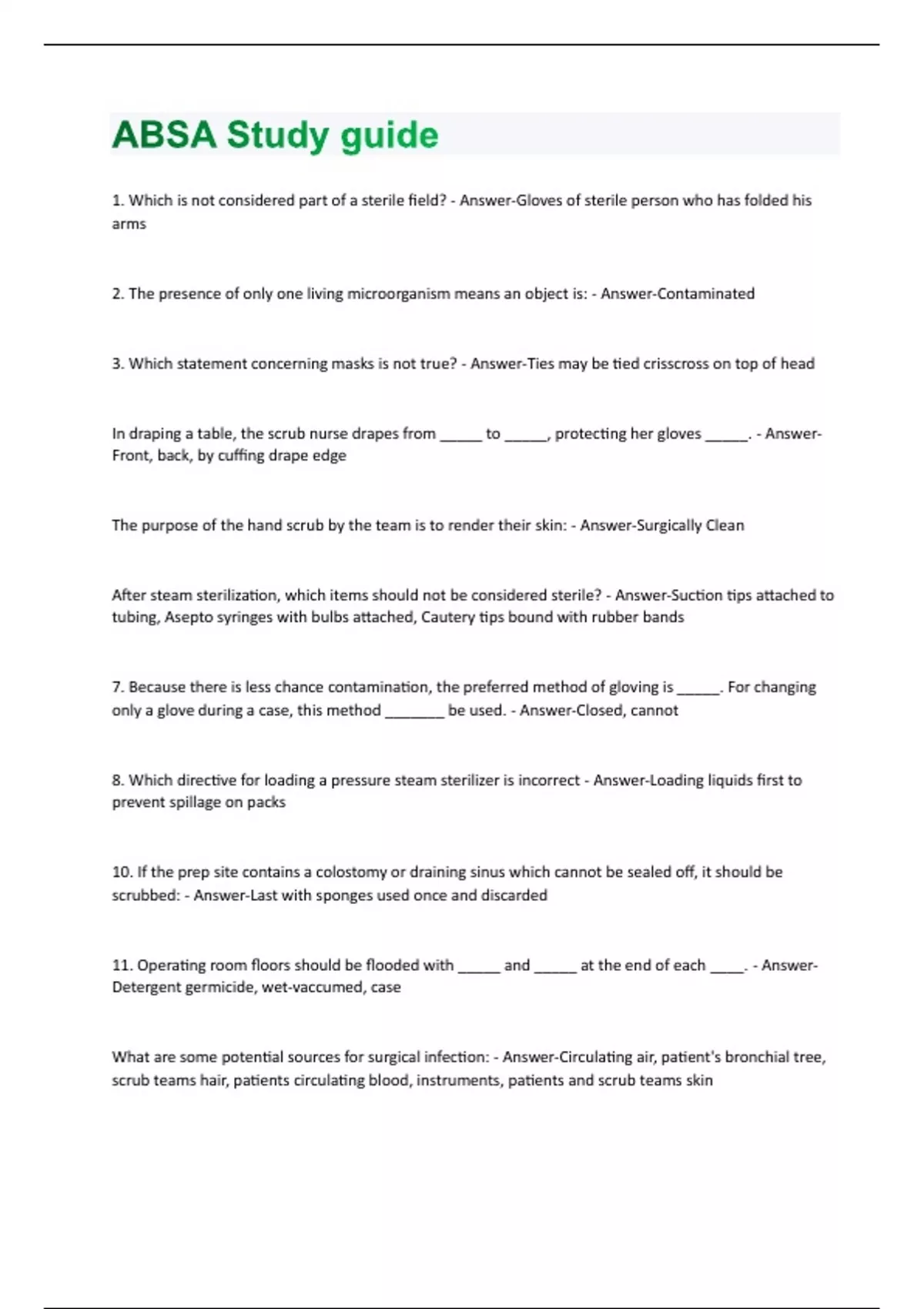 1. Which is not considered part of a sterile field? - Answer-Gloves of sterile person who has folded his arms 2. The presence of only one living microorganism means an object is: - Answer-Contaminated 3. Which statement concerning masks is not true? - Answer-Ties may be tied crisscross on top of head In draping a table, the scrub nurse drapes from _____ to _____, protecting her gloves _____. - AnswerFront, back, by cuffing drape edge The purpose of the hand scrub by the team is to render their skin: - Answer-Surgically Clean After steam sterilization, which items should not be considered sterile? - Answer-Suction tips attached to tubing, Asepto syringes with bulbs attached, Cautery tips bound with rubber bands 7. Because there is less chance contamination, the preferred method of gloving is _____. For changing only a glove during a case, this method _______ be used. - Answer-Closed, cannot 8. Which directive for loading a pressure steam sterilizer is incorrect - Answer-Loading liquids first to prevent spillage on packs 10. If the prep site contains a colostomy or draining sinus which cannot be sealed off, it should be scrubbed: - Answer-Last with sponges used once and discarded 11. Operating room floors should be flooded with _____ and _____ at the end of each ____. - AnswerDetergent germicide, wet-vaccumed, case What are some potential sources for surgical infection: - Answer-Circulating air, patient's bronchial tree, scrub teams hair, patients circulating blood, instruments, patients and scrub teams skinWhich statement regarding the use of masks is false? - Answer-Cross strings behind the head for better aeration Strike-through - Answer-The soaking of moisture through unsterile layers to sterile layers or vice versa Which statement concerning the use of boiling water as a sterilizing agent is false? - Answer-Minimum boiling period is 10 minutes The OR ventilating system ensures controlled air supply: ____ air exchanges per hour are recommended for infection control and a ___ percent humidity is mandatory to suppress static electricity - Answer-25, 50 Which draping principle is false? - Answer-Drape far side of unsterile table first Which are not essential considerations in the design of an OR suite: - Answer-Windows, top floor locations, central corridor 8. Which statement regarding sterile items is false? - Answer-Covered sterile set ups may be used later in the day 9. When is the open glove technique preferred over the closed glove technique? - Answer-To change a glove during a procedure The first step in the decontamination process of instruments after a procedure should be: - AnswerMechanical decontamination washer-sterilizer 11. Which antiseptic solutions are effective against both gram-negative and gram-positive microorganisms - Answer-Iodophors, Chlorhexidine gluconate Which statement regarding sterile technique is false - Answer-Paper or peel-open packages are torn to expose contents13. Which is (are) used to check the effectiveness of sterilizers: - Answer-Biological spore strip Which statement concerning ethylene oxide sterilization is false? - Answer-Polyvinyl chloride wrappers are recommended Predisposing factors that substantially increases the risk of infection are: - Answer-Duration of operation, invasive monitoring techniques, indiscriminate use of antibioties, gastrointestinal surgery, prosthetic devices. An area of a gown considered sterile is ( are ) the ____ while the ____ is considered unsterile. - AnswerSleeves, neck Which is the major source of contamination in the operating room? - Answer-Personnel Which is (are) not effective method (s) of disinfection in an operating room: - Answer-Mercurial compounds, Fogging Which statement concerning pathogenic Streptococci species of microorganism is false? - Answer-They are gram-negative, nonmotile organisms The preferred method of sterilization for heat-sensitive items and anesthesia equipment when EO sterilization is impractical is soaking in: - Answer-Activated glutaraldehyde Which disadvantage in use of muslin wrapper material for sterile packs and items? - Answer-It must be laundered to rehydrate Which statement regarding hexachlorophene as an antiseptie solution is false? - Answer-It is soluble in water Completely unwrapped items may be sterilized in a flash sterilizer at ___ pounds of pressure, ___ degrees F, for ___ minutes - Answer-27, 270, 3