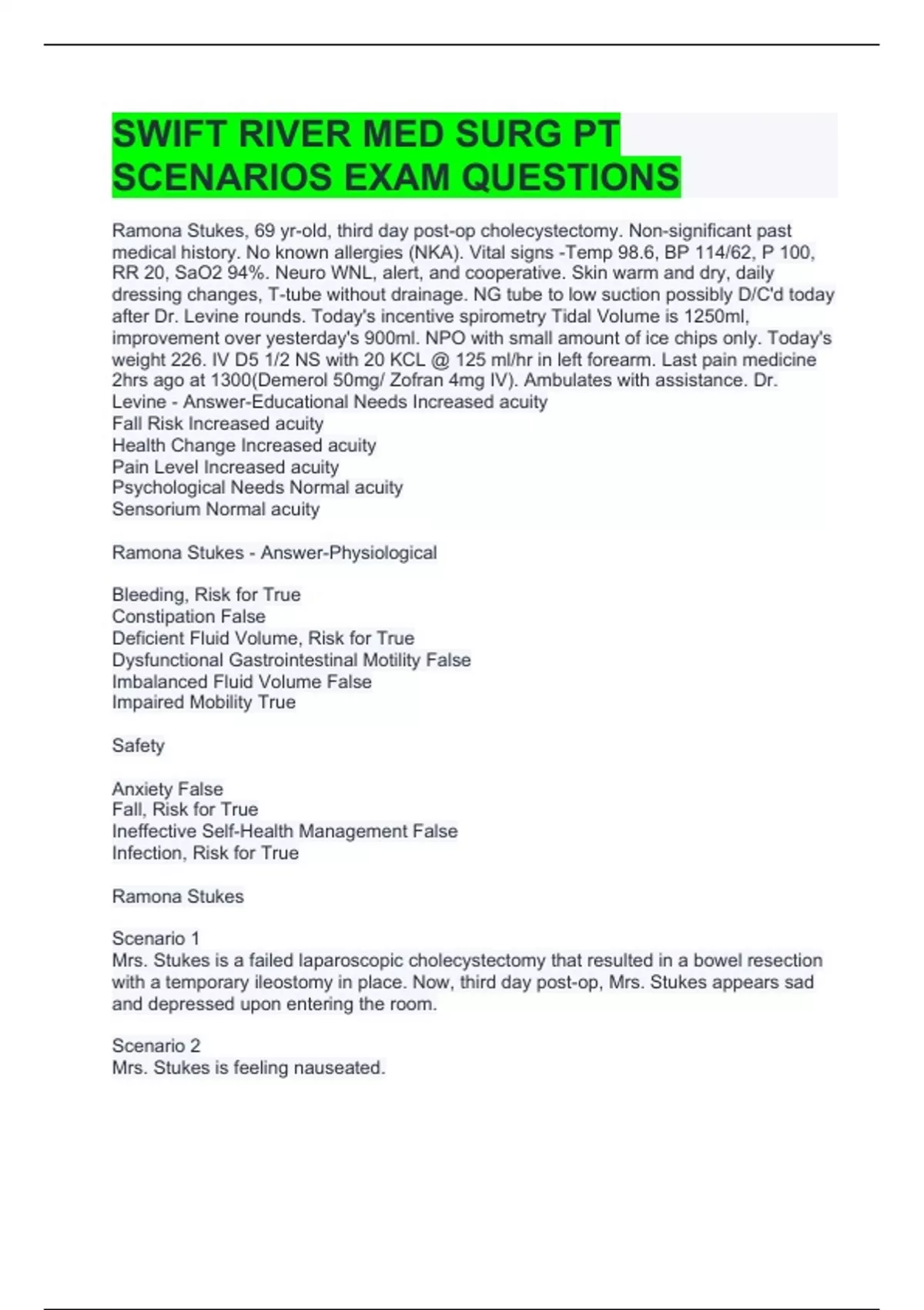SWIFT RIVER MED SURG PT SCENARIOS EXAM QUESTIONS
