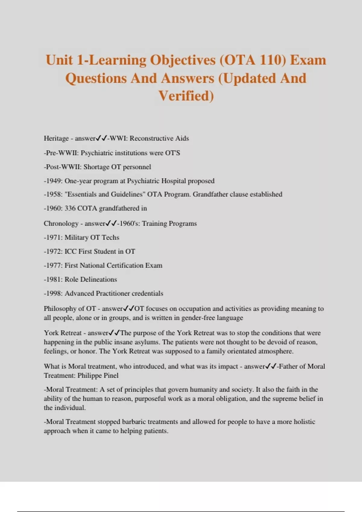 Unit 1-Learning Objectives (OTA 110) Exam Questions And Answers (Updated And Verified) Heritage - answer-WWI: Reconstructive Aids -Pre-WWII: Psychiatric institutions were OT'S -Post-WWII: Shortage OT personnel -1949: One-year program at Psychiatric Hospital proposed -1958: "Essentials and Guidelines" OTA Program. Grandfather clause established -1960: 336 COTA grandfathered in Chronology - answer-1960's: Training Programs -1971: Military OT Techs -1972: ICC First Student in OT -1977: First National Certification Exam -1981: Role Delineations -1998: Advanced Practitioner credentials Philosophy of OT - answerOT focuses on occupation and activities as providing meaning to all people, alone or in groups, and is written in gender-free language York Retreat - answerThe purpose of the York Retreat was to stop the conditions that were happening in the public insane asylums. The patients were not thought to be devoid of reason, feelings, or honor. The York Retreat was supposed to a family orientated atmosphere. What is Moral treatment, who introduced, and what was its impact - answer-Father of Moral Treatment: Philippe Pinel -Moral Treatment: A set of principles that govern humanity and society. It also the faith in the ability of the human to reason, purposeful work as a moral obligation, and the supreme belief in the individual. -Moral Treatment stopped barbaric treatments and allowed for people to have a more holistic approach when it came to helping patients.