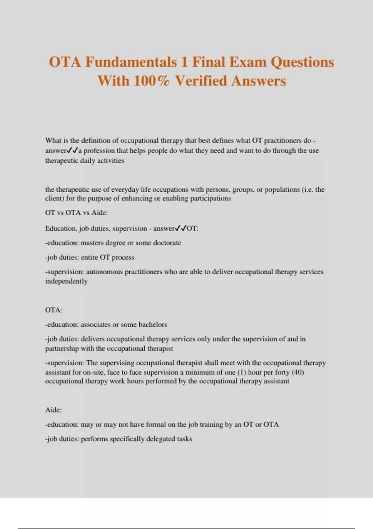OTA Fundamentals 1 Final Exam Questions With 100% Verified Answers What is the definition of occupational therapy that best defines what OT practitioners do - answera profession that helps people do what they need and want to do through the use therapeutic daily activities the therapeutic use of everyday life occupations with persons, groups, or populations (i.e. the client) for the purpose of enhancing or enabling participations OT vs OTA vs Aide: Education, job duties, supervision - answerOT: -education: masters degree or some doctorate -job duties: entire OT process -supervision: autonomous practitioners who are able to deliver occupational therapy services independently OTA: -education: associates or some bachelors -job duties: delivers occupational therapy services only under the supervision of and in partnership with the occupational therapist -supervision: The supervising occupational therapist shall meet with the occupational therapy assistant for on-site, face to face supervision a minimum of one (1) hour per forty (40) occupational therapy work hours performed by the occupational therapy assistant Aide: -education: may or may not have formal on the job training by an OT or OTA -job duties: performs specifically delegated tasks -supervision: in sight of OT or OTA who were the two key people of the moral treatment movement - answerPhillipe Pinel and William Turke Eleanor Clark Slagle - answeroften called "the mother of occupational therapy" habit training, there is an award named after her, through her work at Hull House is how OT came forward Phillipe Pinel - answerthe father of moral treatment, he used farming terms to divert attention from illness and develop skills William Tuke - answerEnglish Quaker who established the York retreat, where mental patients lived in humane surroundings; used occupations as means of control vs drug/restraints John Ruskin - answerarts and crafts movement Thomas Kidner - answerAn architect influential in establishing a presence for OT in vocational rehabilitation and tb treatment manual training and wrote an arts and crafts book Mary Reilly - answershe was upset that OT has lost its roots and in the 1960s in her Eleanor Clarke Slagle Lecture expressed "That man, through the use of his hands as they are energized by mind and will, can influence the state of his own health her ideas became of the basis of future models of practice Occupational Behavior Model (1970s) Benjamin Rush - answer"father of American Psychiatry" moral treatment in the US Adolf Meyer - answerA Swiss physician committed to a holistic perspective his view is what became the philosophy of OT William Dunton - answerFather of OT credited with emphasis on publication; wrote a manual called "Occupational Therapy: a Manual for Nurses George Barton - answerafter contracting TB devoted the rest of his life to service for people with physical challenges An architect who established Consolation House credited with being the first person to coin the term "occupational therapy" Susan Cox Johnson - answerArts and crafts teacher and advocate for using crafts as a therapeutic tool Susan Tracy - answeroccupational nurse and educator wrote the first book about Occupational Therapy; Studies in Invalid Occupations Herbert James Hall - answerPsychiatrist reductionistic view of health, he saw the value of doing things, believed in the work cure Jane Addams - answerthe founder of Hull House and she worked there the role of reconstruction aides, the period of the World Wars and development of OTA - answerbefore the WWI there was more focus on the mental illness aspect and then WW1 started reconstructions aides initiated by the US military at Walter Reed Hospital where there were programs under orthopedic professionals and included OT; there was a need for education for OT and then training programs emerged and OT treated physical disabilities; when WWII came everyone was back to how things were because the Great Depression slowed growth for OT and the US was not prepared for WWII, there was a need for more practitioners and there was official recognition for OT during WW2, role of OTA was developed because there was need for more OT practitioners and they initially had them focus on mental health what is a philosophy - answerthe study of why people think and act the way that they do what does the Philosophical Base of OT say - answerthe current philosophy of OT practitioners that addresses: what are occupations the need for and benefit of participation in occupations