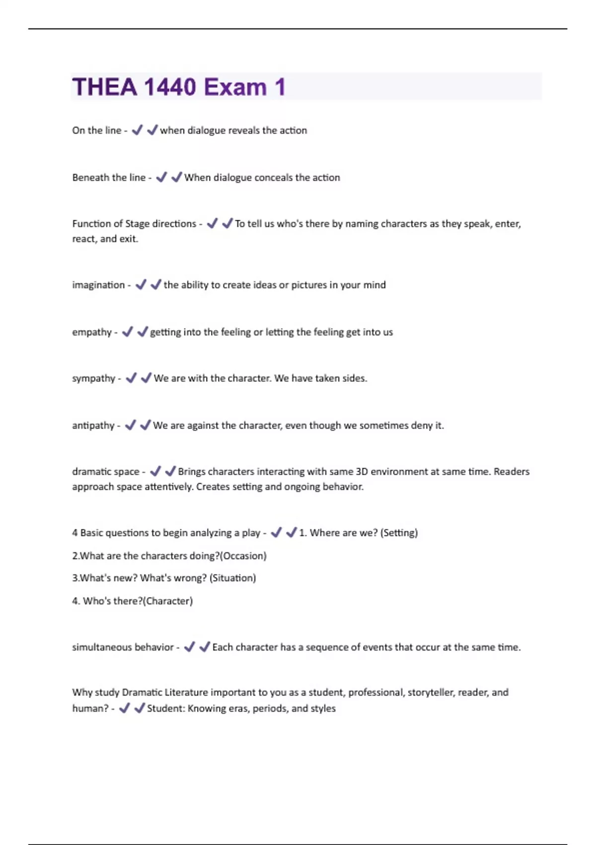 On the line - when dialogue reveals the action Beneath the line - When dialogue conceals the action Function of Stage directions - To tell us who's there by naming characters as they speak, enter, react, and exit. imagination - the ability to create ideas or pictures in your mind empathy - getting into the feeling or letting the feeling get into us sympathy - We are with the character. We have taken sides. antipathy - We are against the character, even though we sometimes deny it. dramatic space - Brings characters interacting with same 3D environment at same time. Readers approach space attentively. Creates setting and ongoing behavior. 4 Basic questions to begin analyzing a play - 1. Where are we? (Setting) 2.What are the characters doing?(Occasion) 3.What's new? What's wrong? (Situation) 4. Who's there?(Character) simultaneous behavior - Each character has a sequence of events that occur at the same time. Why study Dramatic Literature important to you as a student, professional, storyteller, reader, and human? - Student: Knowing eras, periods, and stylesProfessional: Bases for artistic choices Storyteller: To hone skills of dramatic empathy Reader: Offers us many version of what it feels like to be human. Linear play structure - Story arranged chronologically. Aristotle's Unity of Action: Action - Is an individual loop Aristotle's Unity of Action: Event - A series of actions linked to one another Plot - Basic order of events as the author arranges them. Protagonist - Carrier of action Antagonist - Opposer of action Balance - A play is in a stasis until one action triggers a chain of events. Exposition - Tells characters background and past events. What audience MUST know. complication - Outside forces or new twists introduced at opportune moment. central conflict - the main problem in the story Rising action - a series of relevant incidents that create suspense, interest and tension in a story. Reversal - Point where the protagonist fortune changes 180.Climax - Highest point of tension Denouement - Final scenes devoted to tying up loose ends.