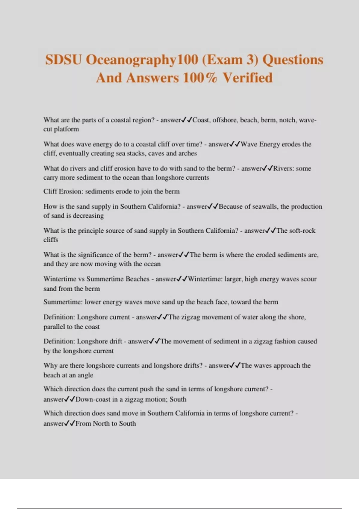 SDSU Oceanography100 (Exam 3) Questions And Answers 100% Verified What are the parts of a coastal region? - answerCoast, offshore, beach, berm, notch, wave- cut platform What does wave energy do to a coastal cliff over time? - answerWave Energy erodes the cliff, eventually creating sea stacks, caves and arches What do rivers and cliff erosion have to do with sand to the berm? - answerRivers: some carry more sediment to the ocean than longshore currents Cliff Erosion: sediments erode to join the berm How is the sand supply in Southern California? - answerBecause of seawalls, the production of sand is decreasing What is the principle source of sand supply in Southern California? - answerThe soft-rock cliffs What is the significance of the berm? - answerThe berm is where the eroded sediments are, and they are now moving with the ocean Wintertime vs Summertime Beaches - answerWintertime: larger, high energy waves scour sand from the berm Summertime: lower energy waves move sand up the beach face, toward the berm Definition: Longshore current - answerThe zigzag movement of water along the shore, parallel to the coast Definition: Longshore drift - answerThe movement of sediment in a zigzag fashion caused by the longshore current Why are there longshore currents and longshore drifts? - answerThe waves approach the beach at an angle Which direction does the current push the sand in terms of longshore current? - answerDown-coast in a zigzag motion; South Which direction does sand move in Southern California in terms of longshore current? - answerFrom North to South What are the characteristics of an Erosional Coast? - answerwell developed cliffs, sea caves, sea arches, marine terraces, wave-cut cliffs Are in areas where tectonic uplift of coast occurs What are the characteristics of a Depositional Coast? - answershore gradually subsiding, spits, bay barriers, tombolos, barrier islands How do erosional and depositional coasts tie in with plate tectonics? - answerActive tectonics lift the plates up Contrast the Atlantic and Gulf to the Pacific Coasts; sea level changes and effect - answerAtlantic: depositional; passive margin; no plate boundary Pacific: Erosional; active margin; Shoreline rises and ocean does not migrate inland Gulf: below sea level; ocean would migrate the farthest inland What are the causes of global sea-level changes? - answerRaising or lowering of the land surface relative to the sea level through movement of Earth's crust How does tectonics (MOR activity) affect sea levels? - answerUplift or subsidence of major portions of continents or ocean basins How does climate affect sea levels? - answerThermal Contraction lowers sea level Thermal Expansion raises sea level What happens if all ice melts on Earth? - answerSea level rises by 70 meters, waters will warm up quicker What areas of the U.S. will be affected most if all ice on Earth were to melt? - answerMemphis and the South Coast because it is very flat How do we change the coastline in an Ice Age vs Global Warming? - answerIce Age: Coastline will grow Global Warming: Coastline will shrink People build houses right on the berm...how? What happens during storms? - answerPeople build houses on the berm by using stills. During storms, the berms are flooded and the homes will be destroyed due to high tides, tsunamis, and swells