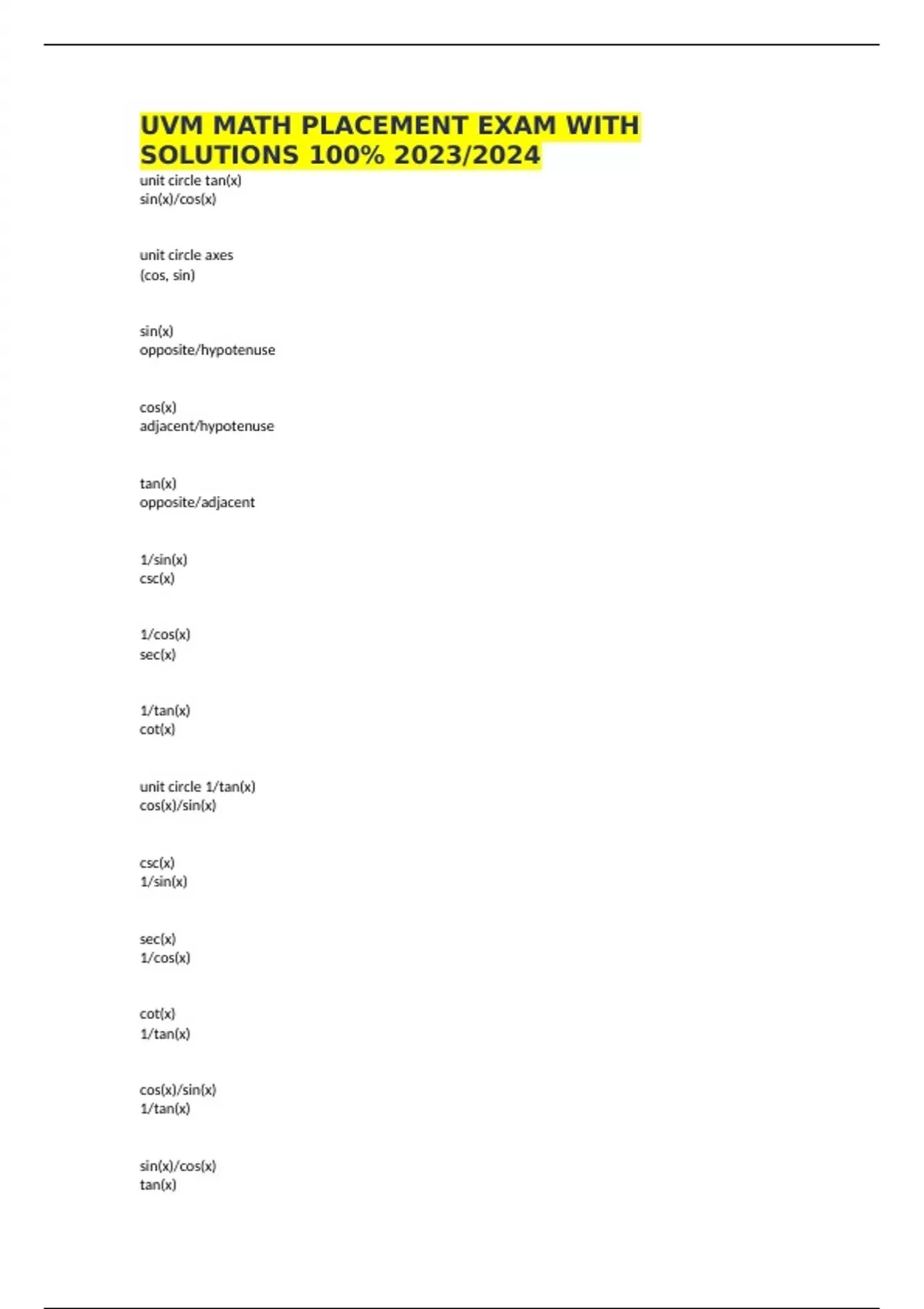 UVM MATH PLACEMENT EXAM WITH SOLUTIONS 100% 2023/2024