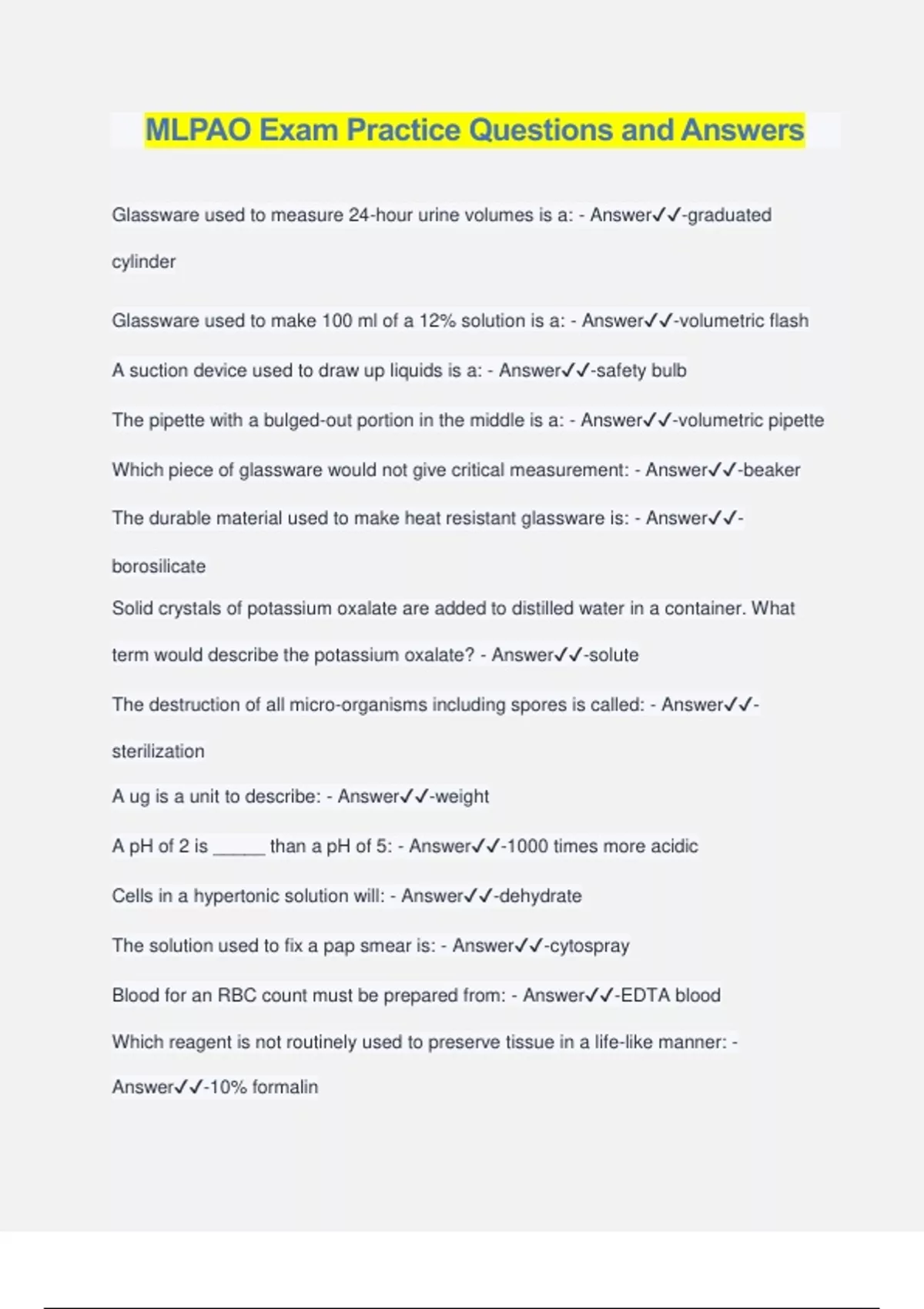 MLPAO Exam Practice Questions and Answers Glassware used to measure 24-hour urine volumes is a: - Answer️️ -graduated cylinder Glassware used to make 100 ml of a 12% solution is a: - Answer️️ -volumetric flash A suction device used to draw up liquids is a: - Answer️️ -safety bulb The pipette with a bulged-out portion in the middle is a: - Answer️️ -volumetric pipette Which piece of glassware would not give critical measurement: - Answer️️ -beaker The durable material used to make heat resistant glassware is: - Answer️️ - borosilicate Solid crystals of potassium oxalate are added to distilled water in a container. What term would describe the potassium oxalate? - Answer️️ -solute The destruction of all micro-organisms including spores is called: - Answer️️ - sterilization A ug is a unit to describe: - Answer️️ -weight A pH of 2 is _____ than a pH of 5: - Answer️️ -1000 times more acidic Cells in a hypertonic solution will: - Answer️️ -dehydrate The solution used to fix a pap smear is: - Answer️️ -cytospray Blood for an RBC count must be prepared from: - Answer️️ -EDTA blood Which reagent is not routinely used to preserve tissue in a life-like manner: - Answer️️ -10% formalin Which piece of histology equipment is not temperature dependent: - Answer️️ - microtome . A biopsy is: - Answer️️ -excision of a representative tissue sample During tissue processing, what is the correct sequence of steps: - Answer️️ - dehydration, clearing, infiltration Fixation is important in tissue processing because it: - Answer️️ --prevents cell morphology changes and shrinkage -allows tissue to be examined in a life-like condition -facilitates the staining process The liquid portion of blood remaining after a clot has formed is called: - Answer️️ - serum Which test could not be performed on a serum sample: - Answer️️ -clotting factors . The shape of a normal erythrocyte is described as: - Answer️️ -biconcave disk Glucose results are correctly reported in: - Answer️️ -mmol/L If a patient refuses to have a venipuncture done you should: - Answer️️ -notify the patients physician Which statement is false when performing a venipuncture: - Answer️️ -the patient's arm is cleansed before palpating the vein A biohazardous container is used to discard: - Answer️️ --lancets -needled Which needle gauge corresponds with the smallest needle size: - Answer️️ -23 The vacutainer tube which is used to collect and separate serum is the: - Answer️️ - SST If a lavender top, plain red top, grey top, and light blue top tubes are collected, what is the order of draw: - Answer️️ -plain red top, light blue, lavender, grey The tourniquet is: - Answer️️ -used to increase venous fill If a patient faints during a venipuncture, you should: - Answer️️ -remove the needle and attend to the patient What vein/veins is not used to obtain a venous blood sample: - Answer️️ -femoral vein A blood specimen collected in a heparinized tube is centrifuged. I