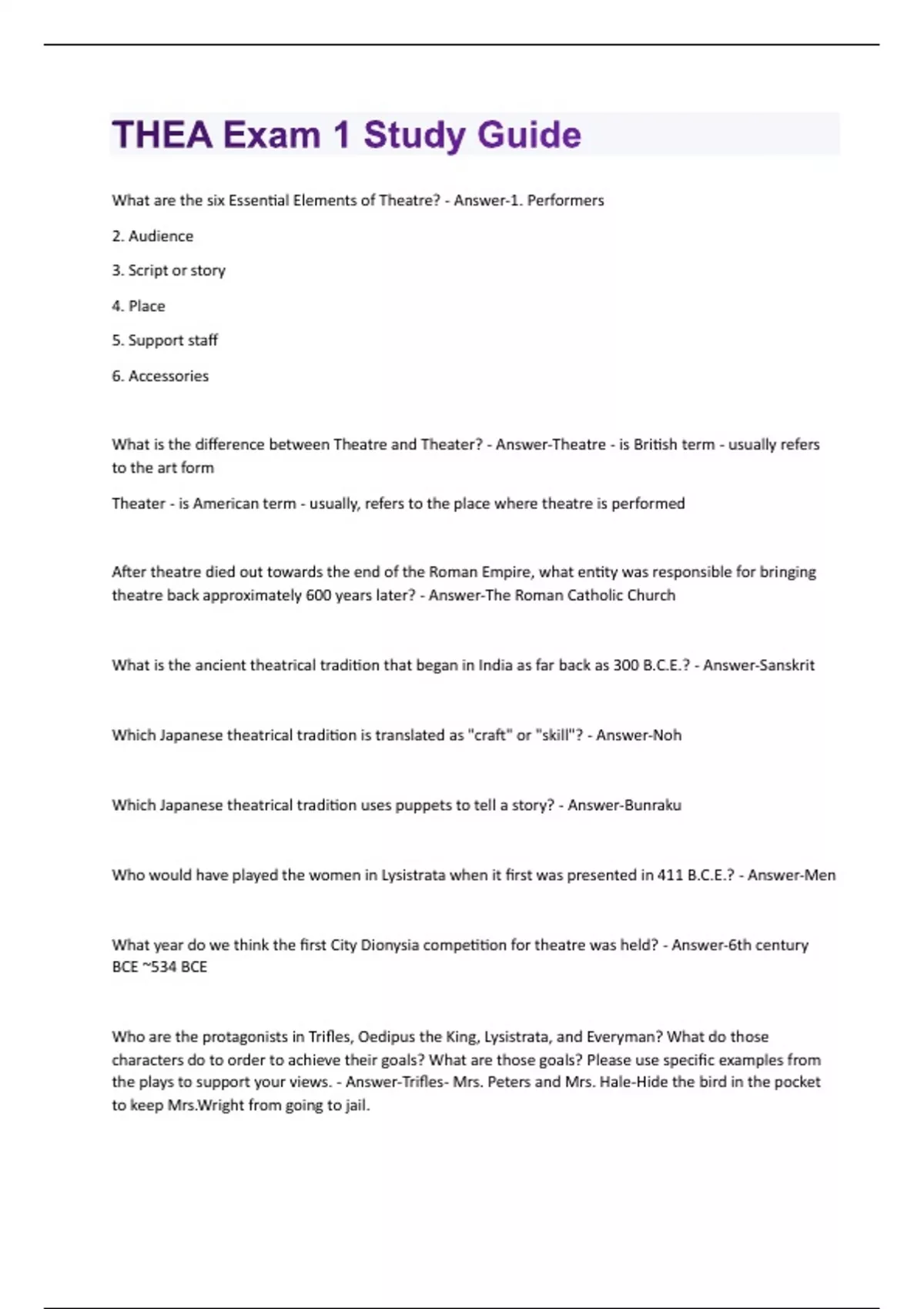 What are the six Essential Elements of Theatre? - Answer-1. Performers 2. Audience 3. Script or story 4. Place 5. Support staff 6. Accessories What is the difference between Theatre and Theater? - Answer-Theatre - is British term - usually refers to the art form Theater - is American term - usually, refers to the place where theatre is performed After theatre died out towards the end of the Roman Empire, what entity was responsible for bringing theatre back approximately 600 years later? - Answer-The Roman Catholic Church What is the ancient theatrical tradition that began in India as far back as 300 B.C.E.? - Answer-Sanskrit Which Japanese theatrical tradition is translated as "craft" or "skill"? - Answer-Noh Which Japanese theatrical tradition uses puppets to tell a story? - Answer-Bunraku Who would have played the women in Lysistrata when it first was presented in 411 B.C.E.? - Answer-Men What year do we think the first City Dionysia competition for theatre was held? - Answer-6th century BCE ~534 BCE Who are the protagonists in Trifles, Oedipus the King, Lysistrata, and Everyman? What do those characters do to order to achieve their goals? What are those goals? Please use specific examples from the plays to support your views. - Answer-Trifles- Mrs. Peters and Mrs. Hale-Hide the bird in the pocket to keep Mrs.Wright from going to jail.Oedipus the King- Oedipus- The story follows the need of the King of Thebes to cure the land of the plagues to such The Oracle tells Oedipus the King to find the killer of the previous king and remove him from city. Lysistrata- Lysistrata & Chorus of Women- The goal is to stop the peloponnesian war by withholding sex and taking over the city. Everyman- Everyman- With the knowledge He is going to die Everyman wants to go to Heaven to do so to do so He tries to bring someone to prove He deserves it, which He ends up needing to help good deeds by having knowledge tell him to do confession before she goes. In Everyman, Trifles, and Oedipus the King, death is an important part of the plot of each play. Which character(s) deaths are talked about in each play and how do those deaths take place? How else is death represented in these plays? Is it a good thing or a bad thing? Please use specific examples from the play to support your views. - Answer-Everyman- Everyman is going to die and this drives the character Everyman to better himself making the knowledge of his death one of the best things that could happen to him. We are unsure of how exactly Everyman dies. Trifles- The story begins with the death of Mr. Wright, but with the help of Mrs.Hale and Mrs. Peters hiding evidence to keep Mrs. Wright from being put to death for his murder. This is morally wrong but is a good thing once you feel bad for her as a symbol for the caged bird that was killed by Mr. Wright. Oedipus the King- Death plays a huge part in the entire plot of this play from the recognition of an issue in Thebes known by the Death of expecting mothers to the prophecy recognition by the murderer of the previous king being in the city still and finding out he is Oedipus. In the Play death only plays a bad role, the death of expecting mothers is a sign of plague over all of Thebes and then to find out that the plague was caused by the murderer of the previous king that still lives in the city caused the plague. What are the two distinctions from other forms of storytelling that Theatre must have in order to called "Theatre?" How does one of those distinctions about Theatre differ from Motion Pictures and Television? BE SPECIFIC! Also, what is Samuel Taylor Coleridge's theatrical term, "The Willing Suspension of Disbelief" and how does it apply to that collaborative relationship between audience and performer? - Answer-In order to be called Theatre, a show must be performed live in front of a live audience. Those qualities are what makes it different from movies and television, which are just pre-recorded images. Samuel Taylor Coleridge, creator of the term "Willing Suspension of Disbelief", Defined the audience's ability to pretend what they are seeing is real in order to enjoy and escape their reality. Being able to suspend your ability to believe what is happening in front of you creates a transitory experience for the audience to connect with the performers.