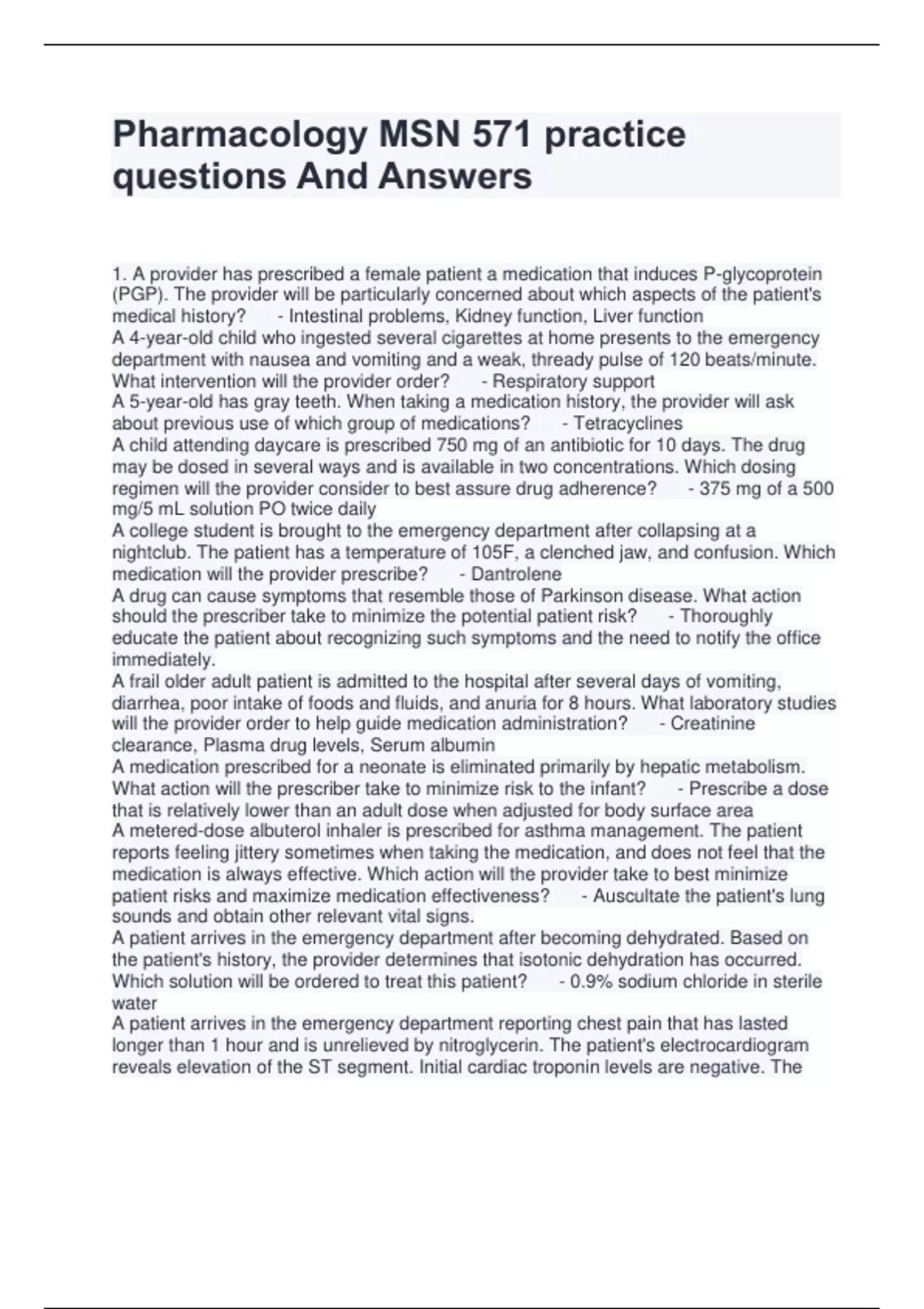 Pharmacology MSN 571 practice questions And Answers 1. A provider has prescribed a female patient a medication that induces P-glycoprotein (PGP). The provider will be particularly concerned about which aspects of the patient's medical history? - Intestinal problems, Kidney function, Liver function A 4-year-old child who ingested several cigarettes at home presents to the emergency department with nausea and vomiting and a weak, thready pulse of 120 beats/minute. What intervention will the provider order? - Respiratory support A 5-year-old has gray teeth. When taking a medication history, the provider will ask about previous use of which group of medications? - Tetracyclines A child attending daycare is prescribed 750 mg of an antibiotic for 10 days. The drug may be dosed in several ways and is available in two concentrations. Which dosing regimen will the provider consider to best assure drug adherence? - 375 mg of a 500 mg/5 mL solution PO twice daily A college student is brought to the emergency department after collapsing at a nightclub. The patient has a temperature of 105F, a clenched jaw, and confusion. Which medication will the provider prescribe? - Dantrolene A drug can cause symptoms that resemble those of Parkinson disease. What action should the prescriber take to minimize the potential patient risk? - Thoroughly educate the patient about recognizing such symptoms and the need to notify the office immediately. A frail older adult patient is admitted to the hospital after several days of vomiting, diarrhea, poor intake of foods and fluids, and anuria for 8 hours. What laboratory studies will the provider order to help guide medication administration? - Creatinine clearance, Plasma drug levels, Serum albumin A medication prescribed for a neonate is eliminated primarily by hepatic metabolism. What action will the prescriber take to minimize risk to the infant? - Prescribe a dose that is relatively lower than an adult dose when adjusted for body surface area A metered-dose albuterol inhaler is prescribed for asthma management. The patient reports feeling jittery sometimes when taking the medication, and does not feel that the medication is always effective. Which action will the provider take to best minimize patient risks and maximize medication effectiveness? - Auscultate the patient's lung sounds and obtain other relevant vital signs. A patient arrives in the emergency department after becoming dehydrated. Based on the patient's history, the provider determines that isotonic dehydration has occurred. Which solution will be ordered to treat this patient? - 0.9% sodium chloride in sterile water A patient arrives in the emergency department reporting chest pain that has lasted longer than 1 hour and is unrelieved by nitroglycerin. The patient's electrocardiogram reveals elevation of the ST segment. Initial cardiac troponin levels are negative. The patient is receiving oxygen via nasal cannula. Which drug will the provider order to be given immediately? - Aspirin 325 mg chewable A patient arrives in the emergency department reporting muscle weakness and drowsiness. The nurse notes a heart rate of 80 beats/minute, a respiratory rate of 18 breaths/minute, and a blood pressure of 90/50 mm Hg. The electrocardiogram reveals an abnormal rhythm. The provider will be most concerned about the patient's use of what medication? - Antacids A patient asks why a combination product containing an opioid analgesic and a nonsteroidal antiinflammatory drug (NSAID) has been prescribed to manage cancer pain. Which response will the provider give the patient? - "The combination provides increased pain relief than when either product is used alone." A patient collapses after running a marathon on a hot day and is brought to the emergency department to be treated for dehydration. The provider will prescribe which therapy? - Intravenous hypotonic fluids administered in stages A patient develops shortness of breath shortly after taking the initial dose of a newly prescribed medication. The patient's heart rate is 86 beats/minute, the respiratory rate is 24 breaths/minute, and the blood pressure is 120/70 mm Hg. The prescriber will discontinue the drug based on the assumption the patient experienced what medication induced effect? - A side effect A patient diagnosed with C. difficile infection is considered a high risk for recurrence. Which medication will the provider prescribed? - Bezlotoxumab A patient diagnosed with chronic pain calls to request an oxycodone (Oxycontin) refill. Which action should the prescriber take initially? - Arrange to schedule an appointment with the patient. A patient diagnosed with heart failure (HF) and taking an angiotensin-converting enzyme (ACE) inhibitor, has developed fibrotic changes in the heart and vessels. Which type of medication will the provider order to counter this development? - Aldosterone antagonist A patient diagnosed with STEMI is about to undergo a primary percutaneous coronary intervention (PCI). Which combination of pharmacotherapeutic agents will the provider prescribe to augment this procedure? - Heparin, aspirin, and clopidogrel A patient had a blood pressures of 150/95 mm Hg and 148/90 mm Hg on two separate office visits. This is consistent with a blood pressure of 145/92 mm Hg taken in an ambulatory setting. The patient's diagnostic tests are all normal. What will the patient's provider order to best manage the patient's hypertension? - A thiazide diuretic A patient has been receiving iron replacement therapy for 2 days after hip replacement surgery. The provider is alerted to the following assessment data: Patient's stools appear black. Patient is pale and reports feeling tired. Patient's heart rate is 98 beats/minute, respirations are 20 breaths/minute, and the blood pressure is 100/50 mm Hg. What order will the provider take initially to best assure appropriate care for this patient? - Hemoglobin and hematocrit (H&H) A patient has been taking metha