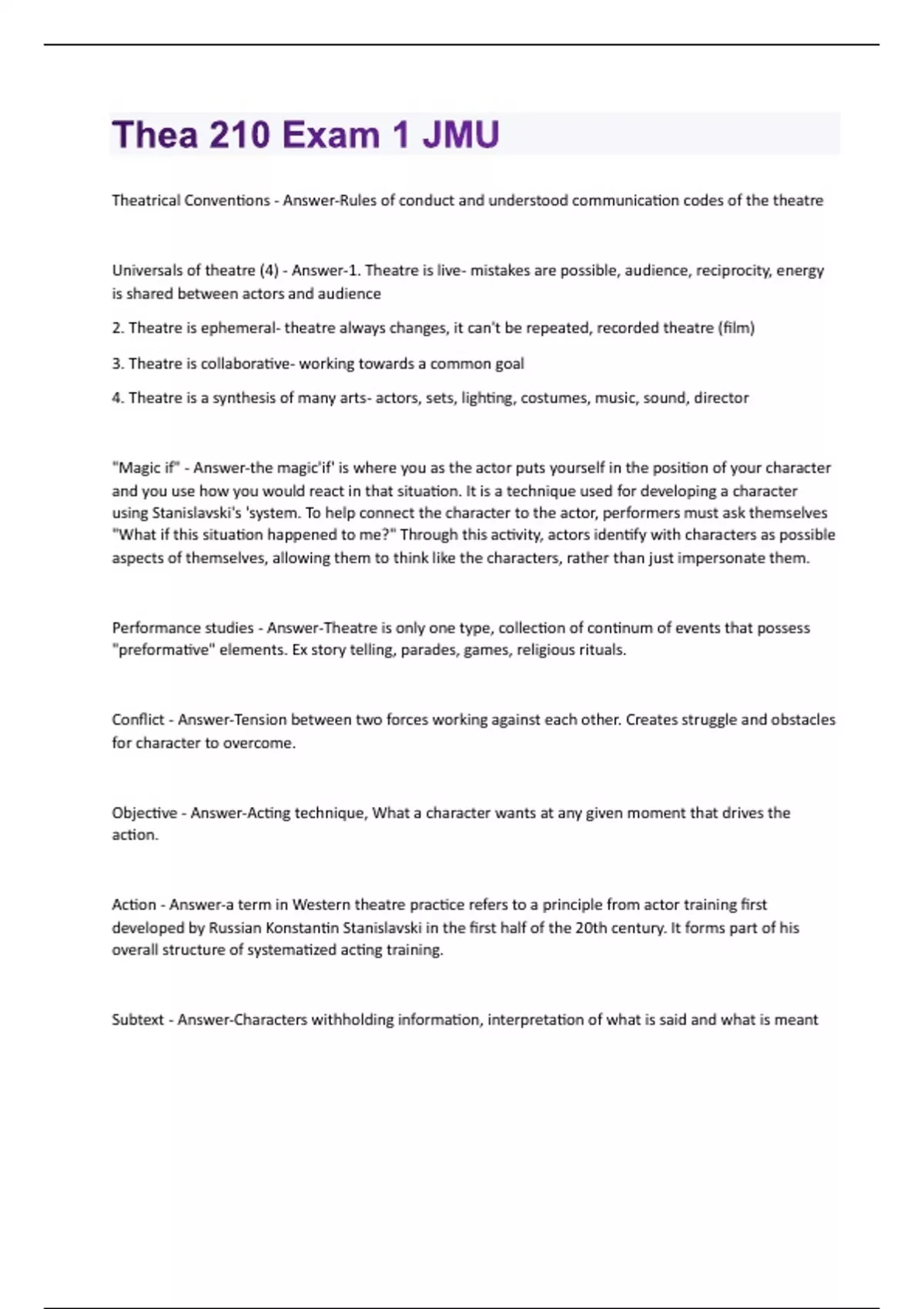 Theatrical Conventions - Answer-Rules of conduct and understood communication codes of the theatre Universals of theatre (4) - Answer-1. Theatre is live- mistakes are possible, audience, reciprocity, energy is shared between actors and audience 2. Theatre is ephemeral- theatre always changes, it can't be repeated, recorded theatre (film) 3. Theatre is collaborative- working towards a common goal 4. Theatre is a synthesis of many arts- actors, sets, lighting, costumes, music, sound, director "Magic if" - Answer-the magic'if' is where you as the actor puts yourself in the position of your character and you use how you would react in that situation. It is a technique used for developing a character using Stanislavski's 'system. To help connect the character to the actor, performers must ask themselves "What if this situation happened to me?" Through this activity, actors identify with characters as possible aspects of themselves, allowing them to think like the characters, rather than just impersonate them. Performance studies - Answer-Theatre is only one type, collection of continum of events that possess "preformative" elements. Ex story telling, parades, games, religious rituals. Conflict - Answer-Tension between two forces working against each other. Creates struggle and obstacles for character to overcome. Objective - Answer-Acting technique, What a character wants at any given moment that drives the action. Action - Answer-a term in Western theatre practice refers to a principle from actor training first developed by Russian Konstantin Stanislavski in the first half of the 20th century. It forms part of his overall structure of systematized acting training. Subtext - Answer-Characters withholding information, interpretation of what is said and what is meant"Willing suspension of disbelief" - Answer-the people in the audience know that what they are seeing on stage or screen is a pretend reality, but they are pretending that they do not know that. They accept the given premises of the story being told in order to empathize with the actors. An example would be knowing that Superman cannot, in reality, fly - and then pretending that you don't know that. The storyteller tells the audience that, in this story, a man can fly. The audience suspends its disbelief and goes along with that premise. Postmoderism - Answer-A late-twentieth-century concept that replaces absolute values with relativism, opening up the possibility of many new and equally valid forms of artistic expression. Globalization - Answer-People travel from place to place and bring their unique culture of theatre with them, Everyone became exposed to a new style. Breaking boundaries. Multiculturalism - Answer-A respect for neighboring cultures living under the same political system Interculturalism - Answer-The blending of traditions from various cultures. Orientalism - Answer-Glamorizing the unusual type of Asian arts, Now implied an imposition of western perspective on Asian forms Stage Directions - Answer-an instruction in the text of a play, especially one indicating the movement, position, or tone of an actor, or the sound effects and lighting. Story vs plot - Answer-Plot is how it unfolds and the Story includes everything that happens in the play, sometimes including information that happened before the play began. climactic structure - Answer-A tight-knit form of play created by Aristotle that limits the scope of events , The number of characters to whom they happen to, and the time in which they transpire. Types of directors - Answer-Modern Director= Much more authoritative goal High concept directing= Changing drastic things to show themeEpisodic structure - Answer-traces the characters through a journey to a final action and to an understanding of what the journey meant.
