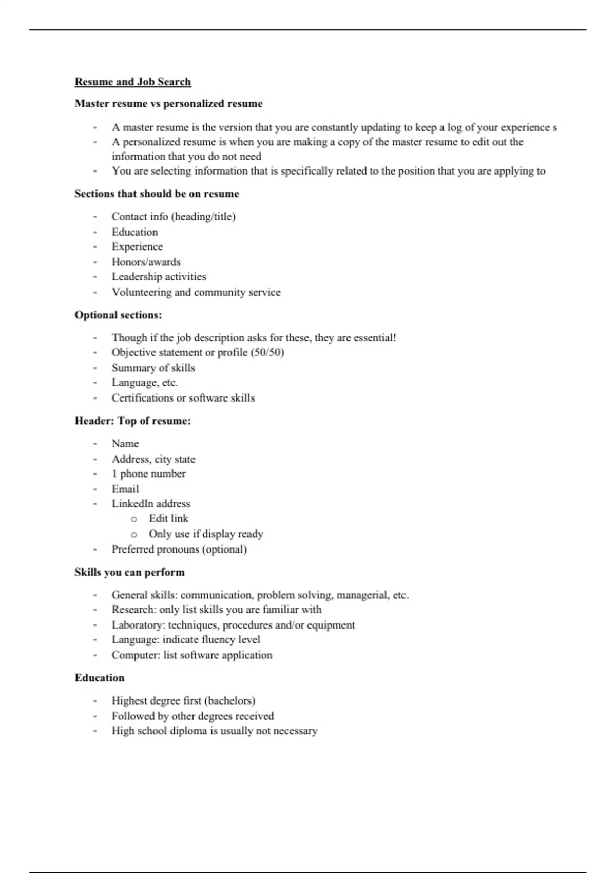 This document provides guidance on crafting a master resume and tailoring personalized resumes for specific job applications. It outlines essential sections such as contact information, education, experience, and optional sections like objective statements and skill summaries, emphasizing the importance of aligning your resume with job descriptions. Detailed advice on listing skills, education, and job experience is included, along with a set of dos and don’ts to ensure professionalism and clarity. By following these guidelines, job seekers can create effective resumes that highlight their qualifications and achievements while avoiding common mistakes.