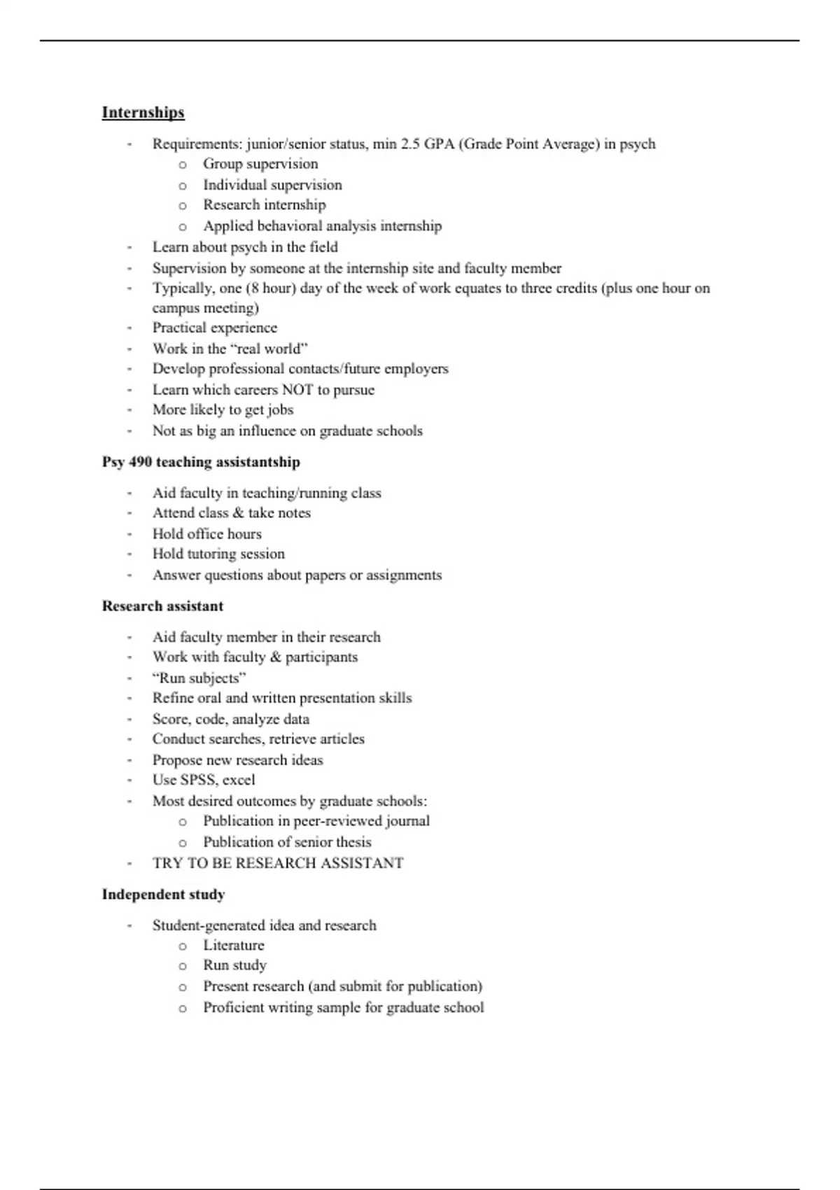 This document outlines various internship opportunities and requirements for psychology students, including junior/senior status and a minimum 2.5 GPA. It covers group and individual supervision, research and applied behavioral analysis internships, and emphasizes the importance of gaining practical experience, professional contacts, and career insights. Additional sections detail roles such as teaching and research assistantships, highlighting tasks like attending classes, holding office hours, running studies, and conducting data analysis. The document also describes independent study and psychology honors programs, noting key achievements like publishing research and presenting at conferences.