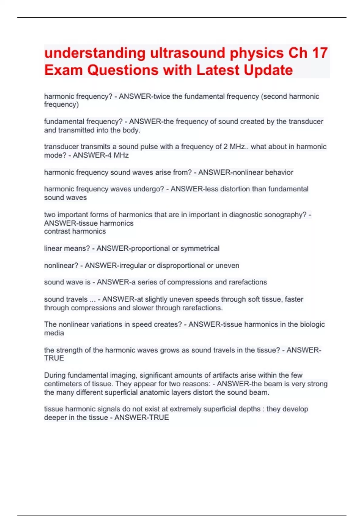 harmonic frequency? - ANSWER-twice the fundamental frequency (second harmonic frequency) fundamental frequency? - ANSWER-the frequency of sound created by the transducer and transmitted into the body. transducer transmits a sound pulse with a frequency of 2 MHz.. what about in harmonic mode? - ANSWER-4 MHz harmonic frequency sound waves arise from? - ANSWER-nonlinear behavior harmonic frequency waves undergo? - ANSWER-less distortion than fundamental sound waves two important forms of harmonics that are in important in diagnostic sonography? - ANSWER-tissue harmonics contrast harmonics linear means? - ANSWER-proportional or symmetrical nonlinear? - ANSWER-irregular or disproportional or uneven sound wave is - ANSWER-a series of compressions and rarefactions sound travels ... - ANSWER-at slightly uneven speeds through soft tissue, faster through compressions and slower through rarefactions. The nonlinear variations in speed creates? - ANSWER-tissue harmonics in the biologic media the strength of the harmonic waves grows as sound travels in the tissue? - ANSWER-TRUE During fundamental imaging, significant amounts of artifacts arise within the few centimeters of tissue. They appear for two reasons: - ANSWER-the beam is very strong the many different superficial anatomic layers distort the sound beam. tissue harmonic signals do not exist at extremely superficial depths : they develop deeper in the tissue - ANSWER-TRUE